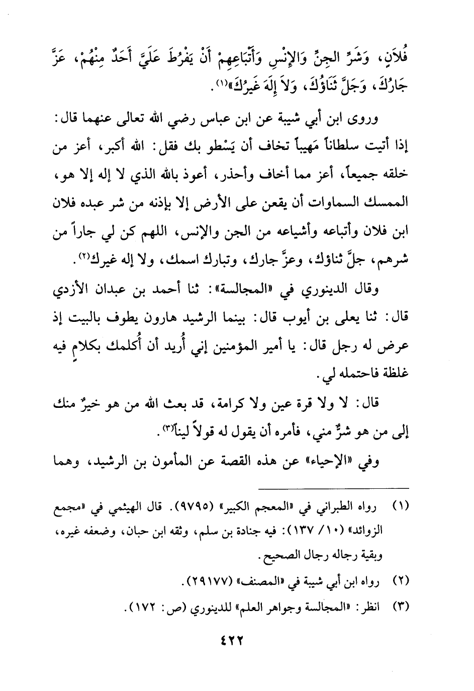 وروى ابن أبي شيبة عن ابن عباس رضي الله تعالى عنهما قال: إذا أتيت سلطاناً مَهيباً تخاف أن يَسْطو بك فقل: الله أكبر، أعز من خلقه جميعاً، أعز مما أخاف وأحذر، أعوذ بالله الذي لا إله إلا هو، الممسك السماوات أن يقعن على الأرض إلا بإذنه من شر عبده فلان ابن فلان وأتباعه وأشياعه من الجن والإنس، اللهم كن لي جاراً من شرهم، جلَّ ثناؤك، وعزَّ جارك، وتبارك اسمك، ولا إله غيرك (¬2).