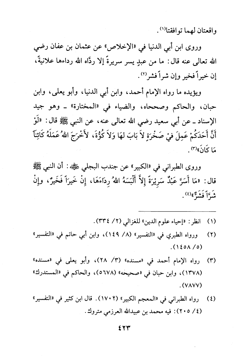 وروى الطبراني في "الكبير" عن جندب البجلي -رضي الله عنه-: أن النبي -صلى الله عليه وسلم- قال: "مَا أَسَرَّ عَبْدٌ سَرِيْرَةً إِلاَّ أَلْبَسَهُ اللهُ رِدَاءَهَا، إِنْ خَيرًا فَخَيرٌ، وإِنْ شَرًّا فَشَرٌّ" (¬4).