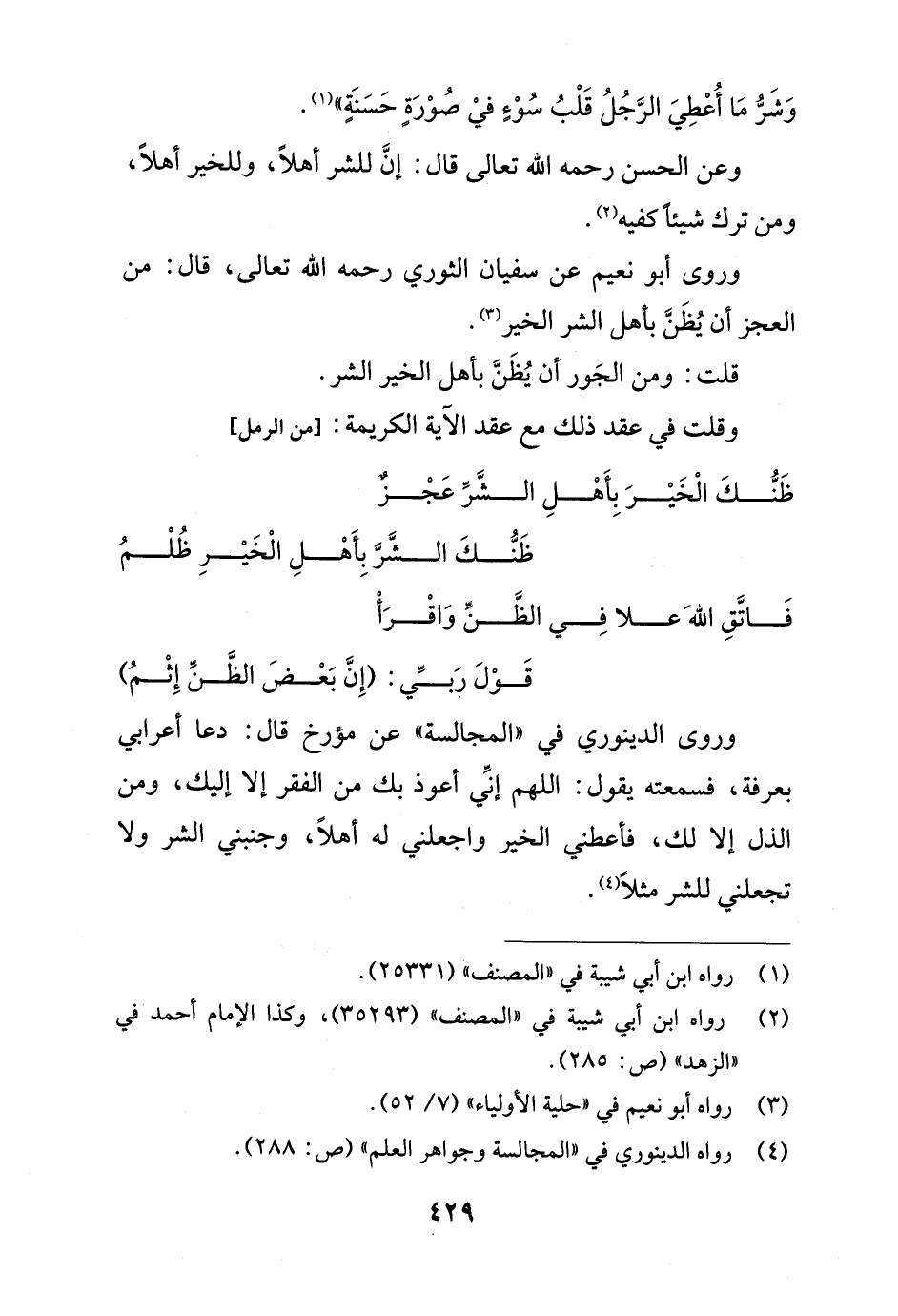 وروى أبو نعيم عن سفيان الثوري رحمه الله تعالى، قال: من العجز أن يُظَنَّ بأهل الشر الخير (¬3).