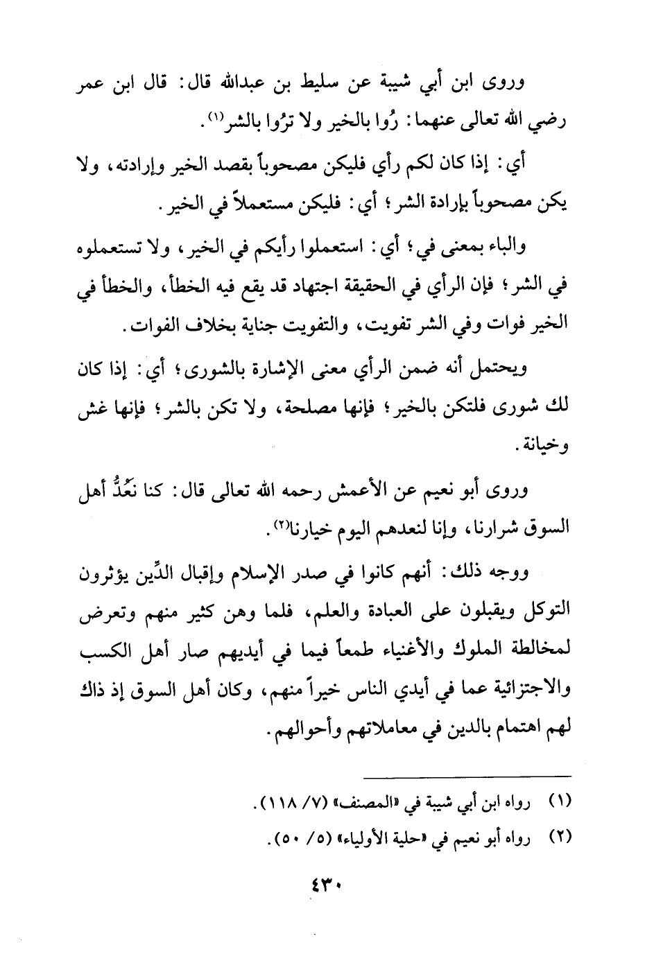 وروى ابن أبي شيبة عن سليط بن عبد الله قال: قال ابن عمر رضي الله تعالى عنهما: رُوا بالخير ولا ترُوا بالشر (¬1).