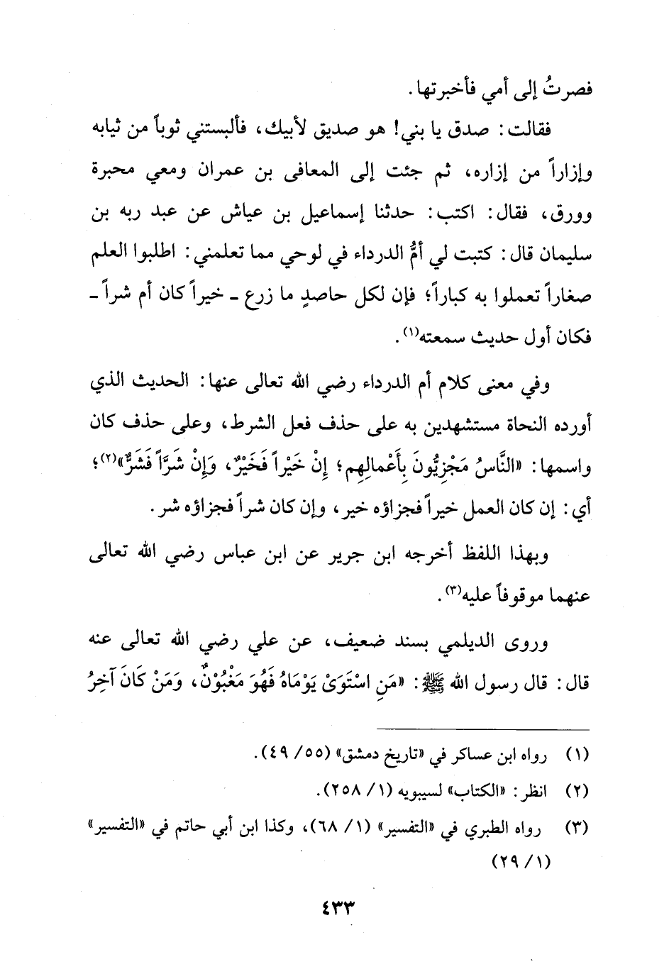 وفي معنى كلام أم الدرداء رضي الله تعالى عنها: الحديث الذي أورده النحاة مستشهدين به على حذف فعل الشرط، وعلى حذف كان واسمها: "النَّاسُ مَجْزِيُّونَ بِأَعْمالِهِم؛ إِنْ خَيْراً فَخَيْرٌ، وَإِنْ شَرًّا فَشَرٌّ" (¬2)؛ أي: إن كان العمل خيراً فجزاؤه خير، وإن كان شراً فجزاؤه شر.