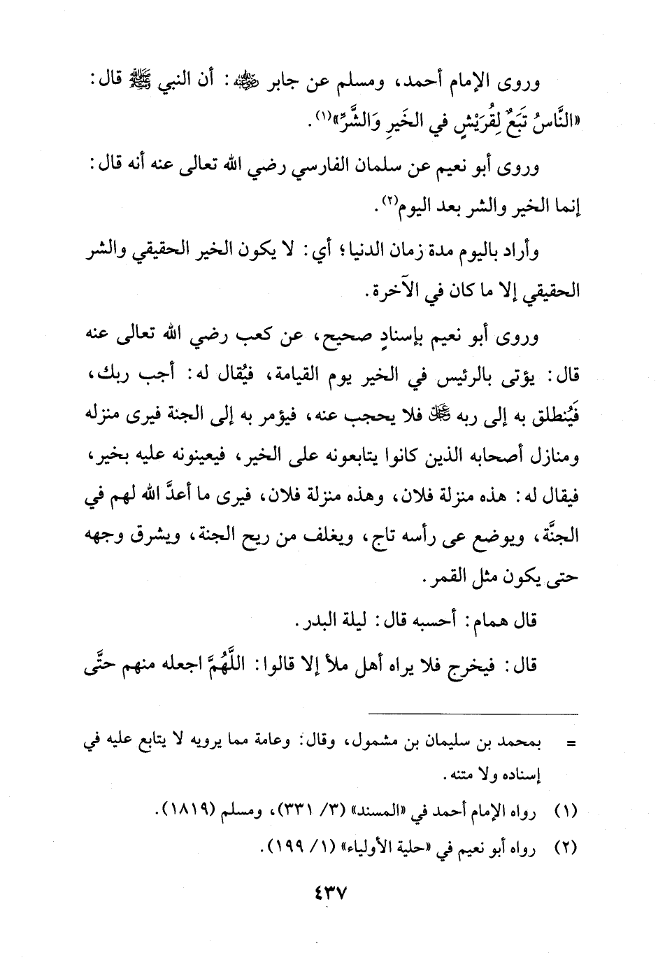 وروى أبو نعيم بإسنادٍ صحيح، عن كعب رضي الله تعالى عنه قال: يؤتى بالرئيس في الخير يوم القيامة، فيُقال له: أجب ربك، فَيُنطلق به إلى ربه عز وجل فلا يحجب عنه، فيؤمر به إلى الجنة فيرى منزله ومنازل أصحابه الذين كانوا يتابعونه على الخير، فيعينونه عليه بخير، فيقال له: هذه منزلة فلان، وهذه منزلة فلان، فيرى ما أعدَّ الله لهم في الجنَّة، ويوضع على رأسه تاج، ويغلف من ريح الجنة، ويشرق وجهه حتى يكون مثل القمر.