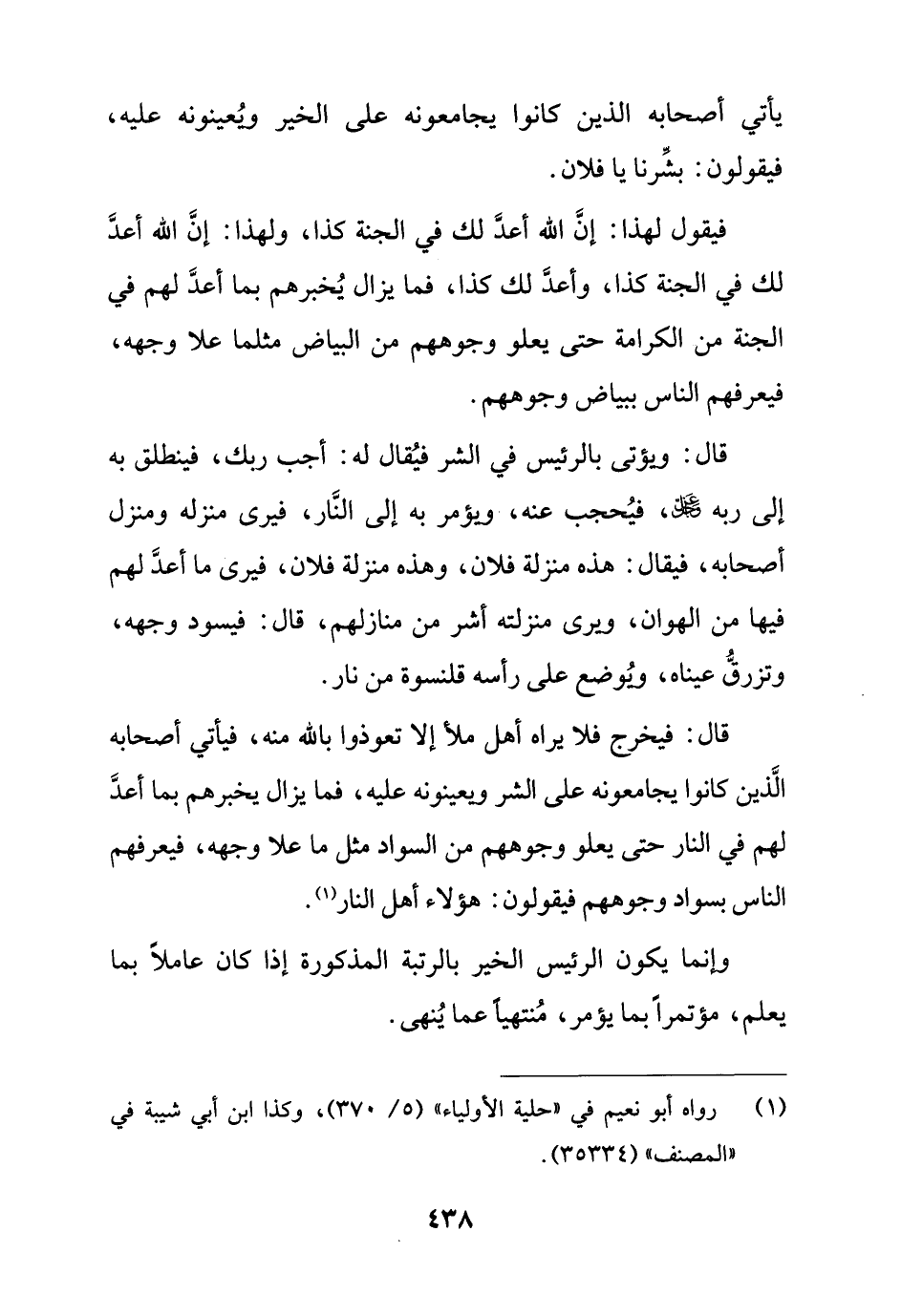 قال: ويؤتى بالرئيس في الشر فيُقال له: أجب ربك، فينطلق به إلى ربه عز وجل، فيُحجب عنه، ويؤمر به إلى النَّار، فيرى منزله ومنزل أصحابه، فيقال: هذه منزلة فلان، وهذه منزلة فلان، فيرى ما أعدَّ لهم فيها من الهوان، ويرى منزلته أشر من منازلهم، قال: فيسود وجهه، وتزرقُّ عيناه، ويوضع على رأسه قلنسوة من نار.