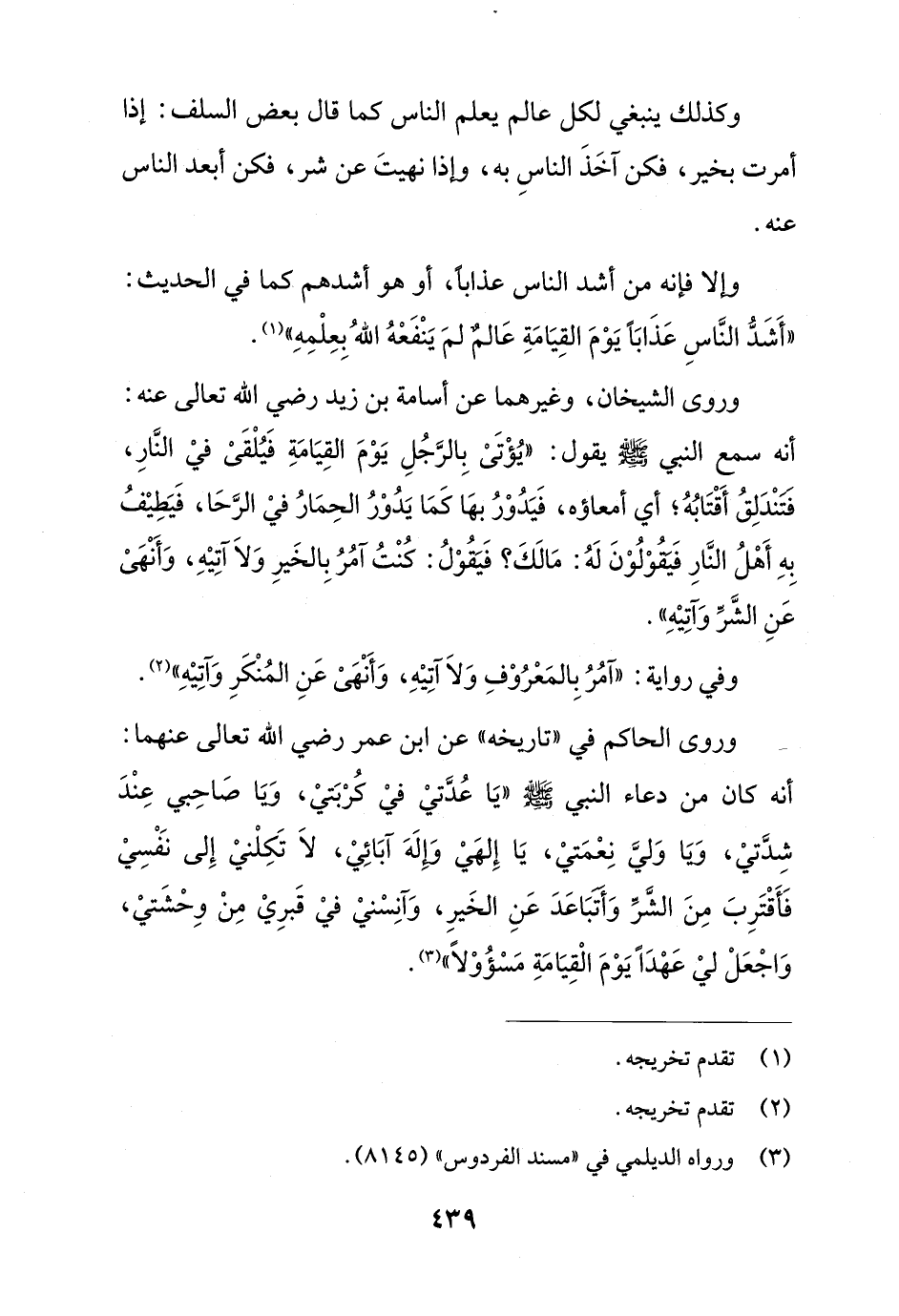 وروى الشيخان، وغيرهما عن أسامة بن زيد رضي الله تعالى عنه: أنه سمع النبي -صلى الله عليه وسلم- يقول: "يُؤْتَىْ بِالرَّجُلِ يَوْمَ القِيَامَةِ فَيُلْقَىْ فيْ النَّارِ، فتَنْدَلِقُ أَقْتَابُهُ؛ أي أمعاؤه، فَيَدُوْرُ بهَا كَمَا يَدُوْرُ الحِمَارُ فيْ الرَّحَا، فَيَطِيْفُ بِهِ أَهْلُ النَّارِ فَيَقُوْلُوْنَ لَهُ: مَالَكَ؟ فَيَقُوْلُ: كُنْتُ آمُرُ بِالخَيرِ وَلاَ آتِيْهِ، وَأَنْهَىْ عَنِ الشَّرِّ وَآتِيْهِ".