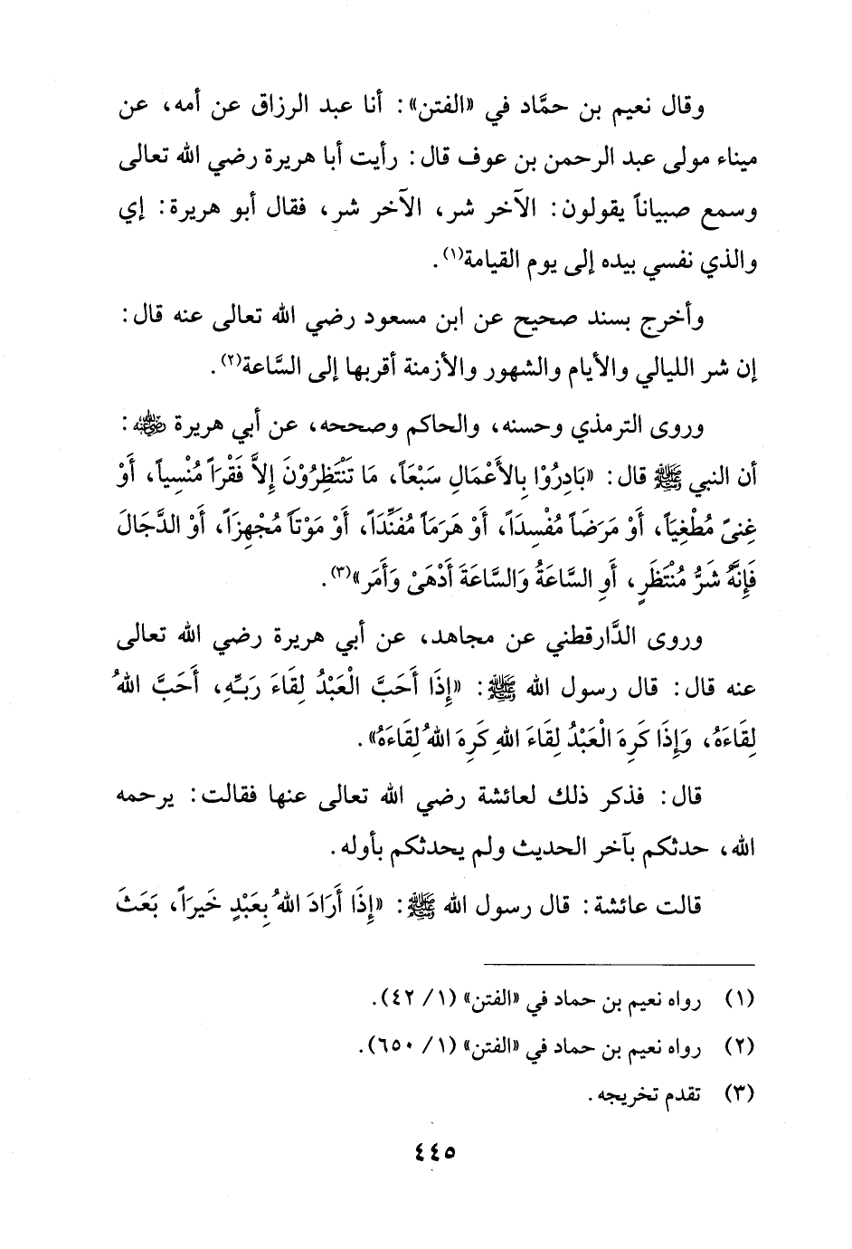 وأخرج بسند صحيح عن ابن مسعود رضي الله تعالى عنه قال: إن شر الليالي والأيام والشهور والأزمنة أقربها إلى السَّاعة (¬2).