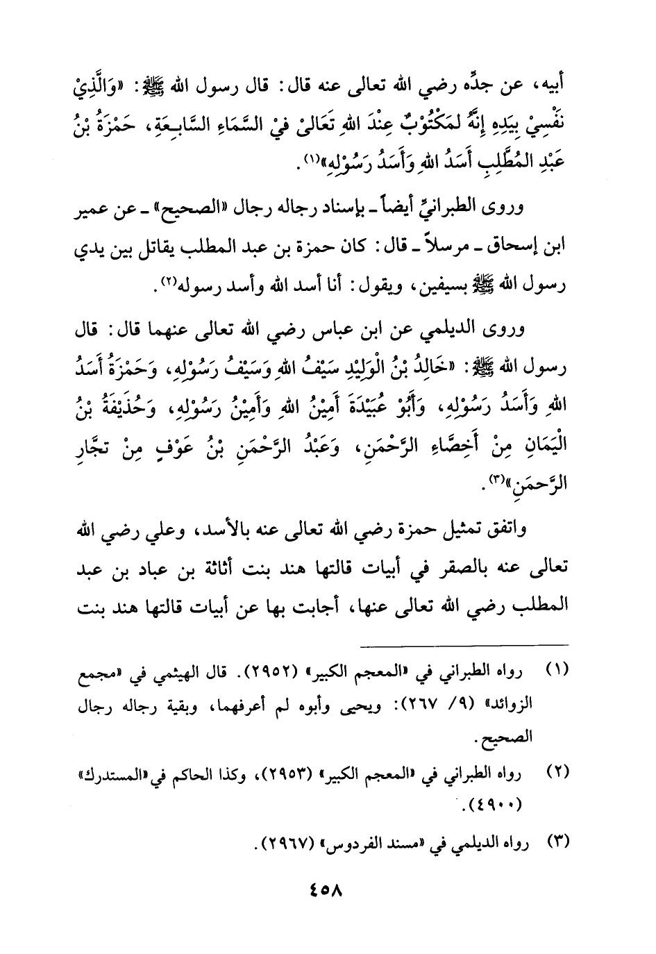 أبيه، عن جدِّه رضي الله تعالى عنه قال: قال رسول الله -صلى الله عليه وسلم-: "وَالَّذِيْ نَفْسِيْ بِيَدهِ إِنَّهُ لمَكْتُوْبٌ عِنْدَ اللهِ تَعَالىْ فيْ السَّمَاءِ السَّابِعَةِ، حَمْزَةُ بْنُ عَبْدِ المُطَّلِبِ أَسَدُ اللهِ وَأَسَدُ رَسُوْلهِ" (¬1).