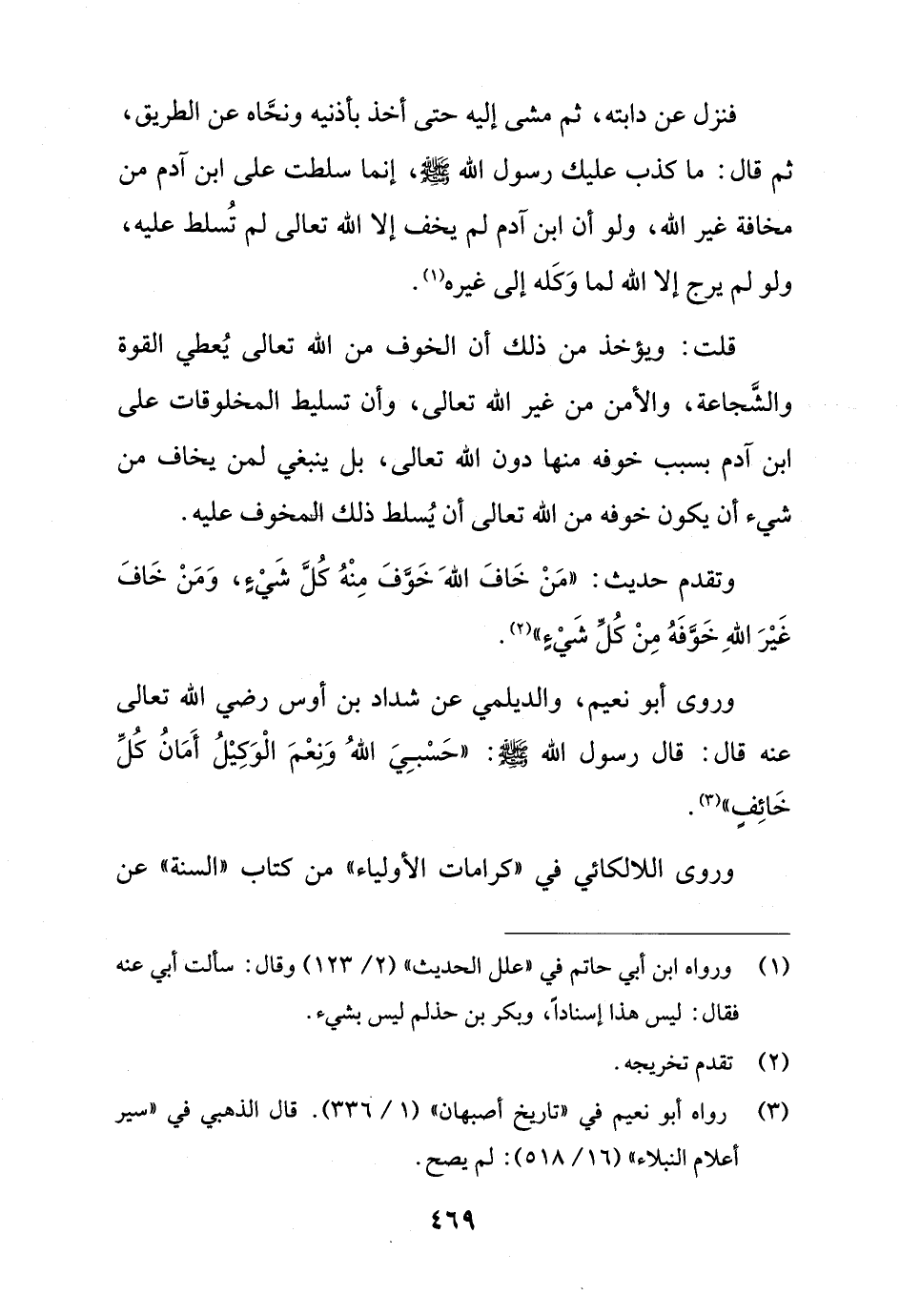 فنزل عن دابته، ثم مشى إليه حتى أخذ بأذنيه ونحَّاه عن الطريق، ثم قال: ما كذب عليك رسول الله -صلى الله عليه وسلم-، إنما سلطت على ابن آدم من مخافة غير الله، ولو أن ابن آدم لم يخف إلا الله تعالى لم تُسلط عليه، ولو لم يرج إلا الله لما وَكَله إلى غيره (¬1).