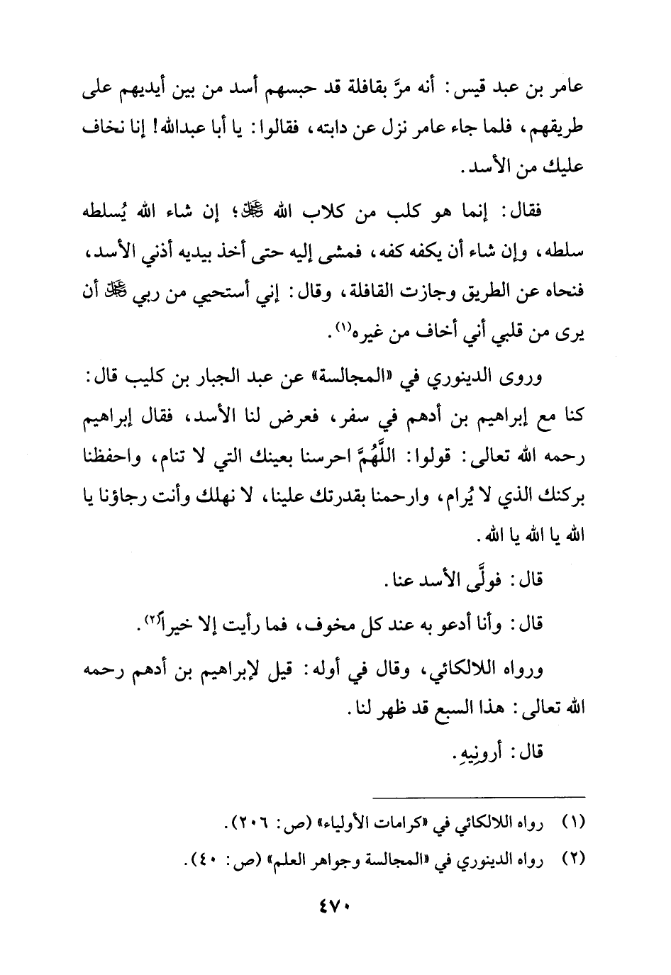 وروى الدينوري في "المجالسة" عن عبد الجبار بن كليب قال: كنا مع إبراهيم بن أدهم في سفر، فعرض لنا الأسد، فقال إبراهيم رحمه الله تعالى: قولوا: اللَّهُمَّ احرسنا بعينك التي لا تنام، واحفظنا بركنك الذي لا يُرام، وارحمنا بقدرتك علينا، لا نهلك وأنت رجاؤنا يا الله يا الله يا الله.