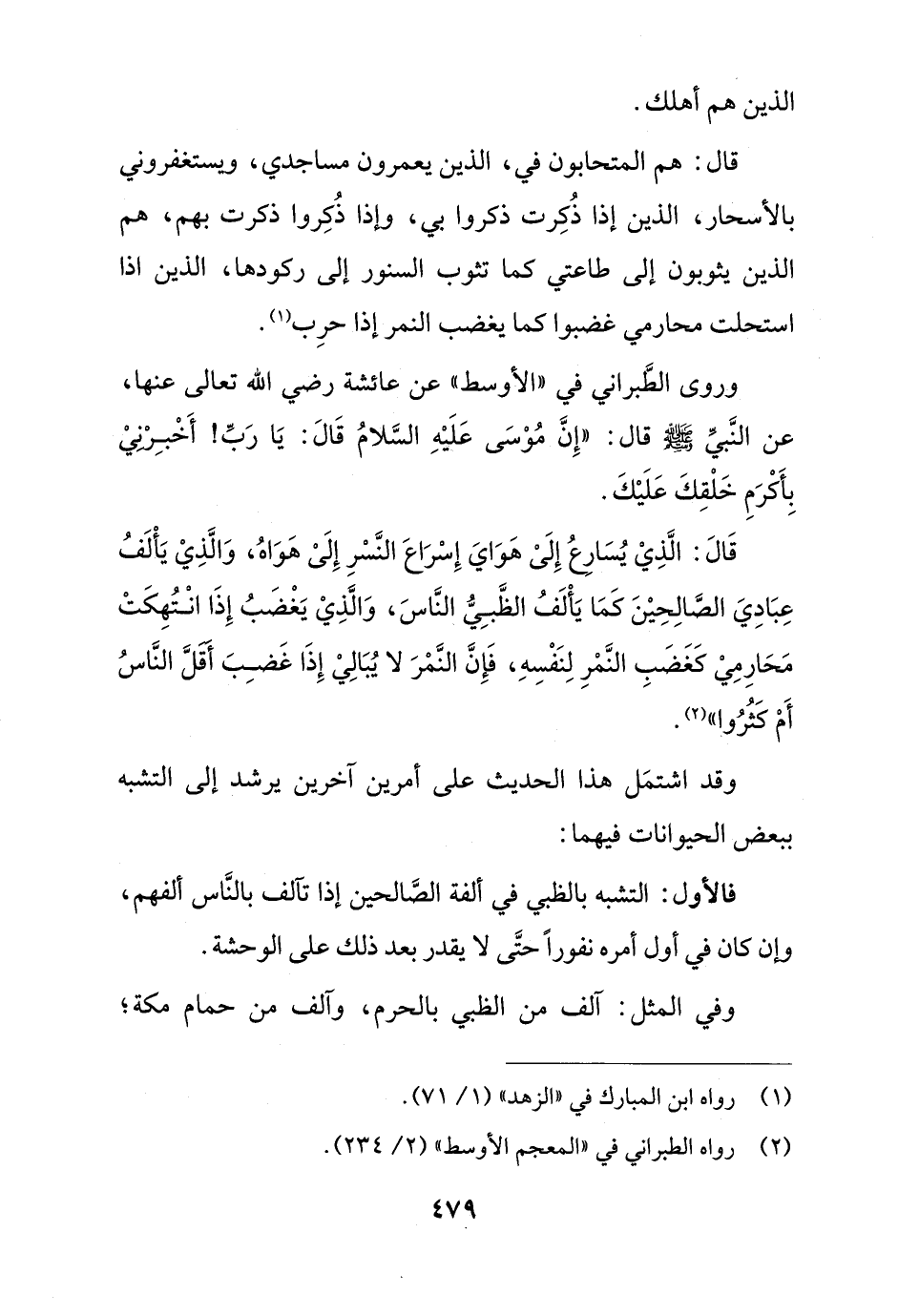 قَالَ: الَّذِيْ يُسَارِعُ إِلَىْ هَوَايَ إِسْرَاعَ النَّسْرِ إِلَىْ هَوَاهُ، وَالَّذِيْ يَأْلَفُ عِبَادِيَ الصَّالِحِيْنَ كَمَا يَأْلَفُ الظَّبِيُّ النَّاسَ، وَالَّذِيْ يَغْضَبُ إِذَا انْتُهِكَتْ مَحَارِمِيْ كَغَضَبِ النَّمْرِ لِنَفْسِهِ، فَإِنَّ النَّمْرَ لا يُبَالِيْ إِذَا غَضِبَ أقلَّ النَّاسُ أَمْ كَثُرُوا" (¬2).
