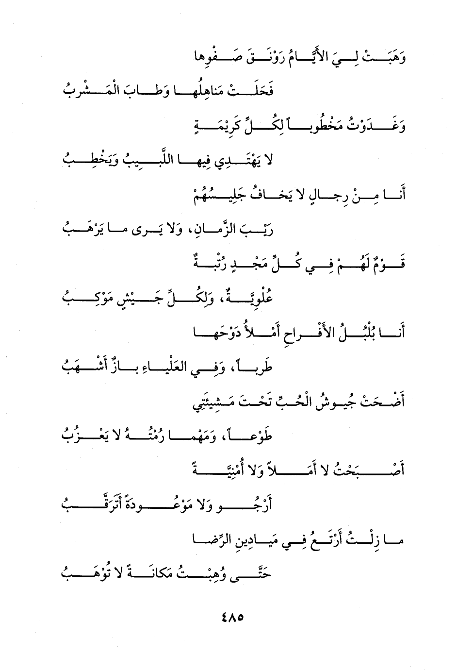 وَهَبَتْ لِيَ الأَيَّامُ رَوْنَقَ صَفْوِها ... فَحَلَتْ مَناهِلُها وَطابَ الْمَشْربُ
