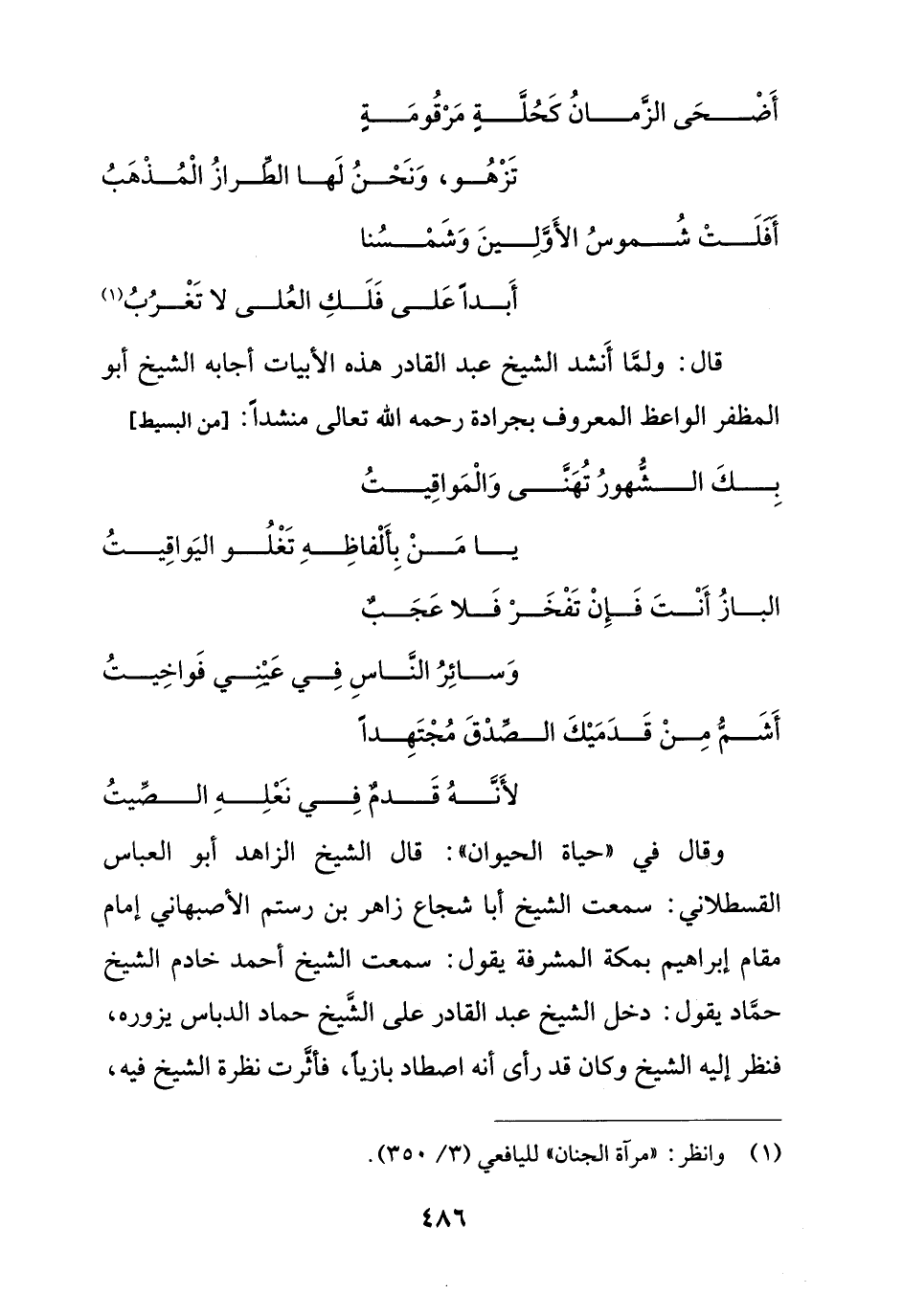 قال: ولمَّا أَنشد الشيخ عبد القادر هذه الأبيات أجابه الشيخ أبو