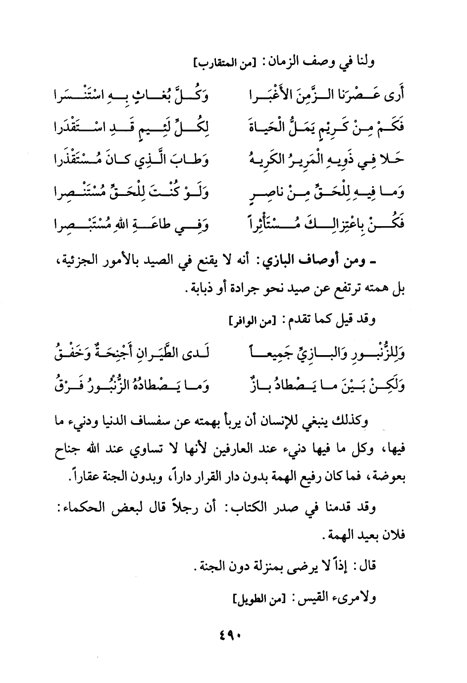 - ومن أوصاف البازي: أنه لا يقنع في الصيد بالأمور الجزئية، بل همته ترتفع عن صيد نحو جرادة أو ذبابة.