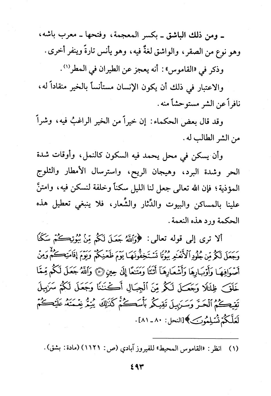 وأن يسكن في محل يحمد فيه السكون كالنمل، وأوقات شدة الحر وشدة البرد، وهيجان الريح، واسترسال الأمطار والثلوج المؤذية؛ فإن الله تعالى جعل لنا الليل سكناً وخلفة لنسكن فيه، وامتنَّ علينا بالمساكن والبيوت والدِّثار والشِّعار، فلا ينبغي تعطيل هذه الحكمة ورد هذه النعمة.