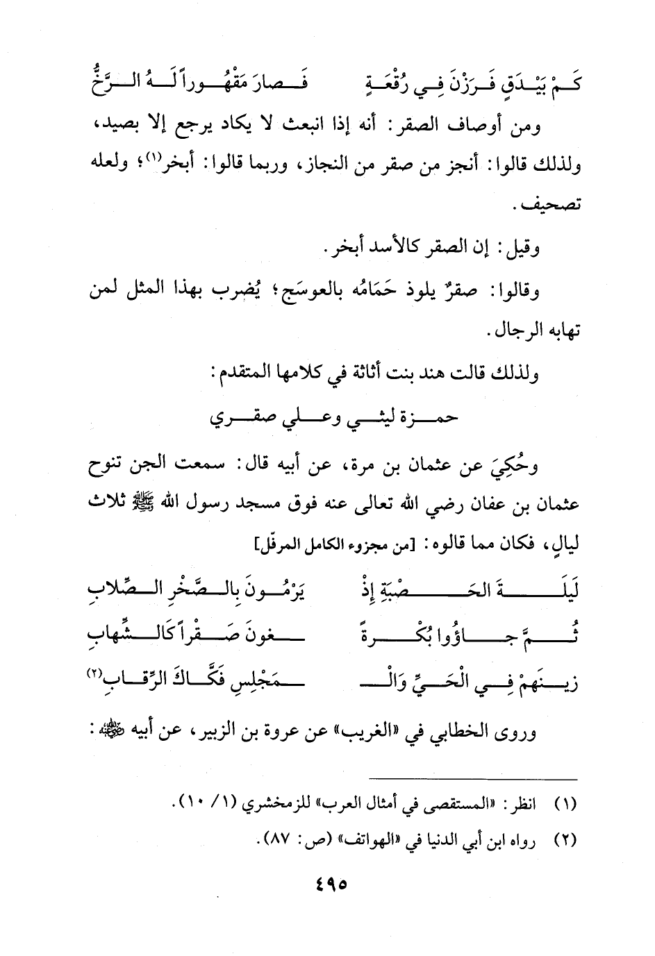 ومن أوصاف الصقر: أنه إذا انبعث لا يكاد يرجع إلا بصيد، ولذلك قالوا: أنجز من صقر من النجاز، وربما قالوا: أبخر (¬1)؛ ولعله تصحيف.