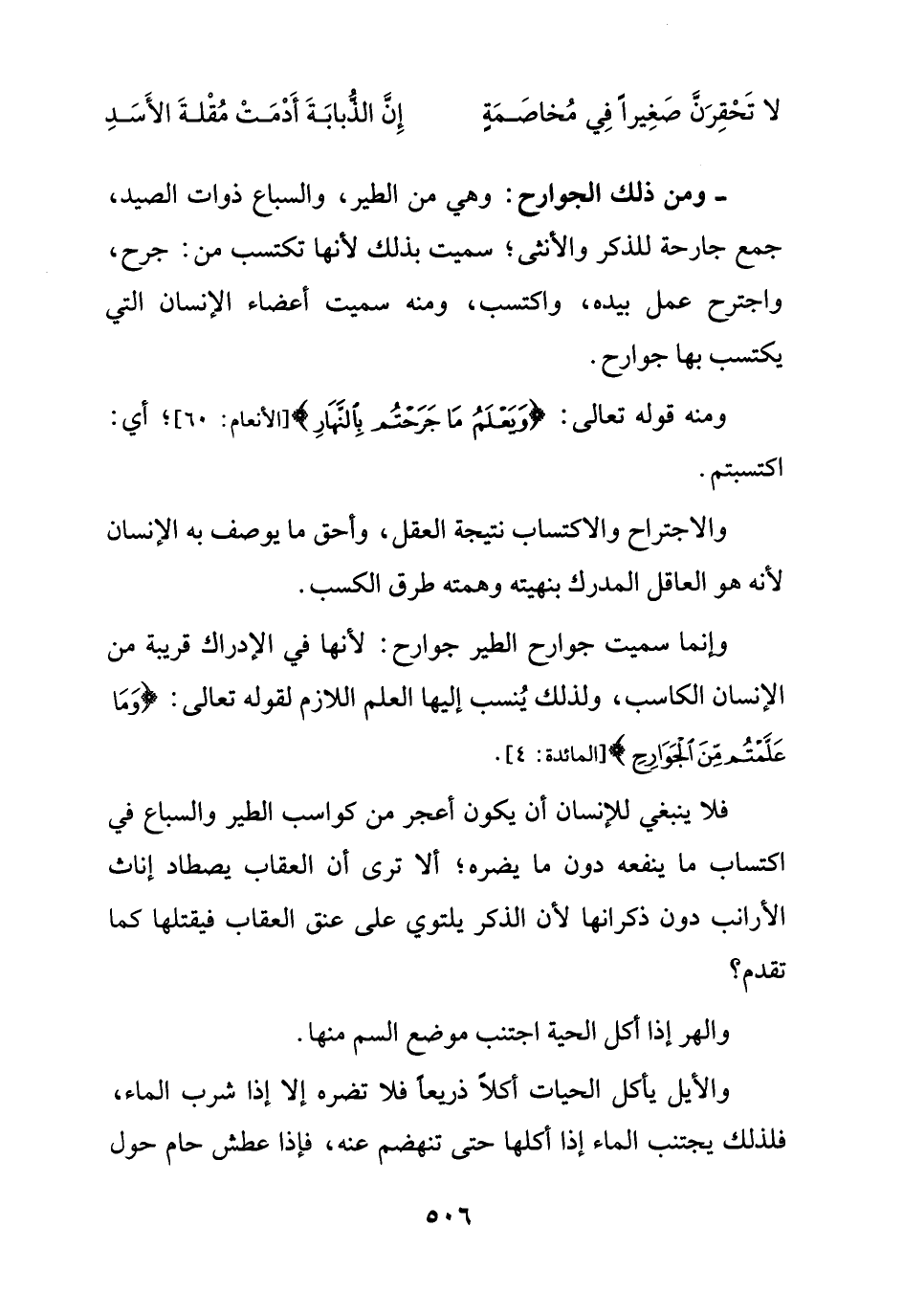 فلا ينبغي للإنسان أن يكون أعجر من كواسب الطير والسباع في اكتساب ما ينفعه دون ما يضره؛ ألا ترى أن العقاب يصطاد إناث الأرانب دون ذكرانها لأن الذكر يلتوي على عنق العقاب فيقتلها كما تقدم؟