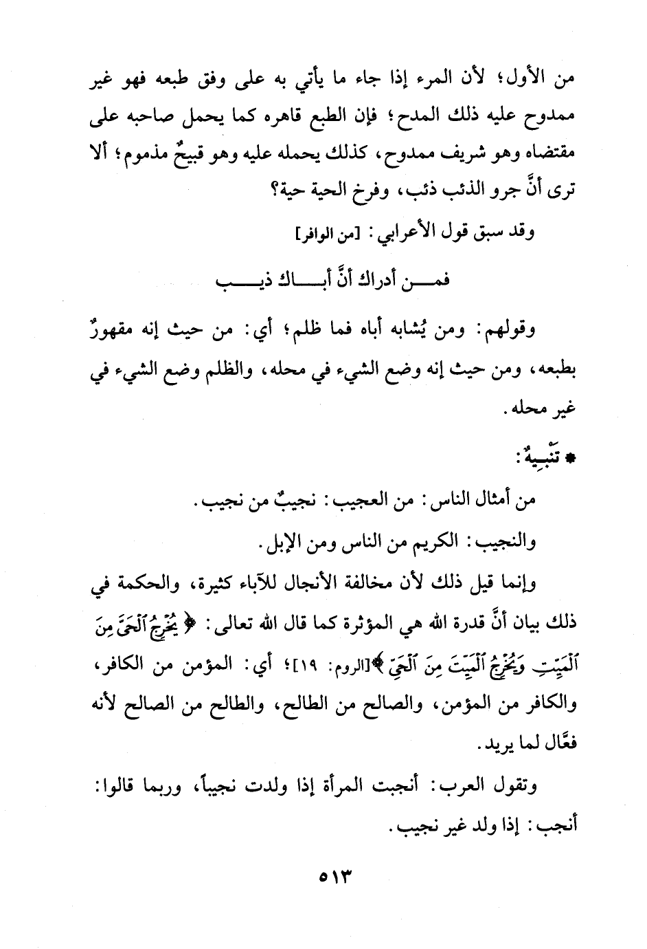 من الأول؛ لأن المرء إذا جاء ما يأتي به على وفق طبعه فهو غير ممدوح عليه ذلك المدح؛ فإن الطبع قاهره كما يحمل صاحبه على مقتضاه وهو شريف ممدوح، كذلك يحمله عليه وهو قبيحٌ مذموم؛ ألا ترى أنَّ جرو الذئب ذئب، وفرخ الحية حية؟