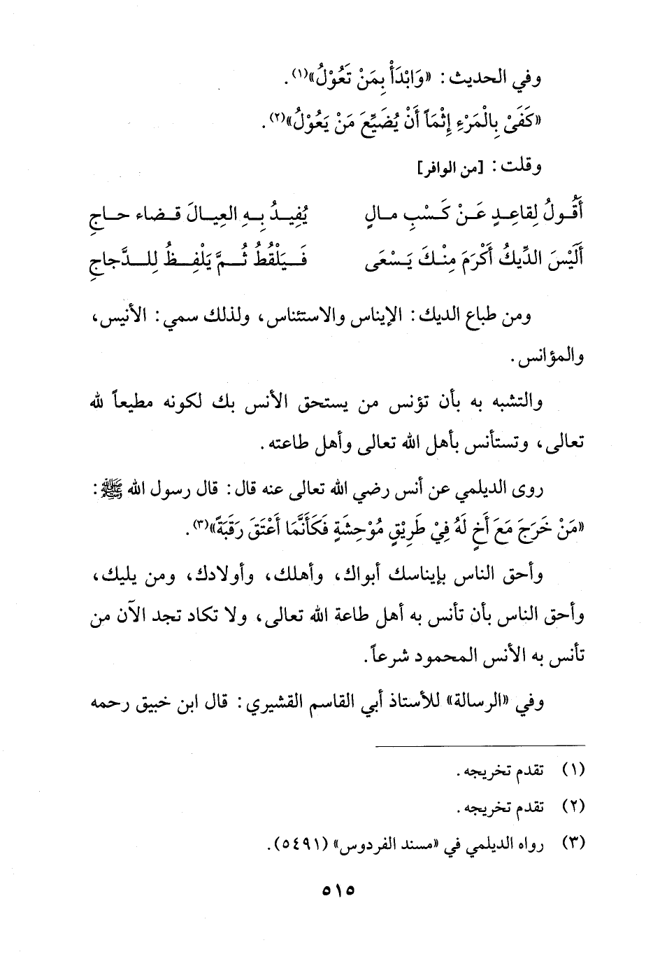 وأحق الناس بإيناسك أبواك، وأهلك، وأولادك، ومن يليك، وأحق الناس بأن تأنس به أهل طاعة الله تعالى، ولا تكاد تجد الآن من تأنس به الأنس المحمود شرعاً.