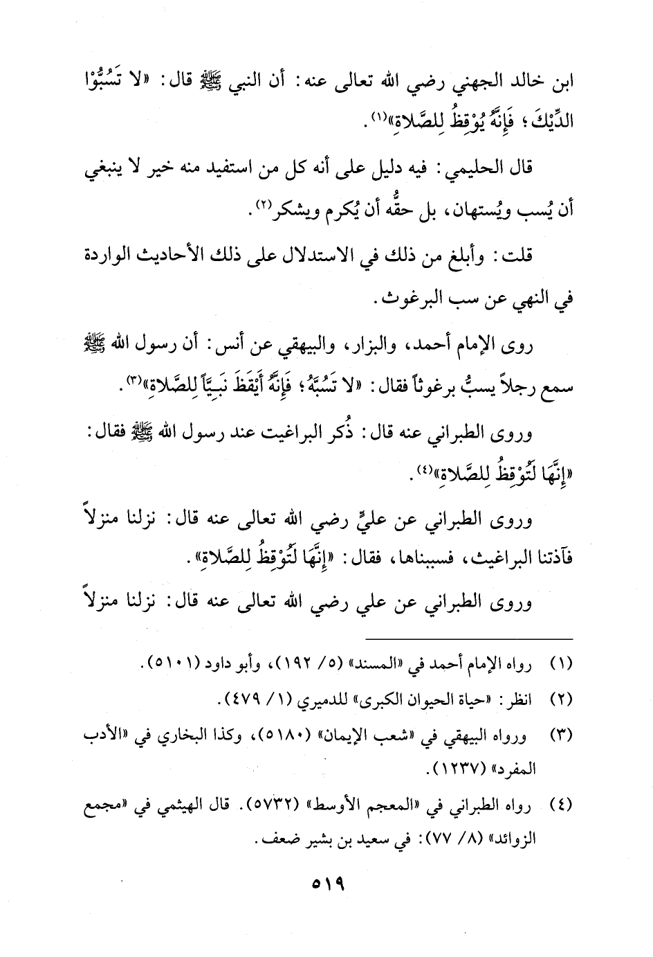 روى الإمام أحمد، والبزار، والبيهقي عن أنس: أن رسول الله - صلى الله عليه وسلم - سمع رجلاً يسبُّ برغوثاً فقال: "لا تَسُبَّهُ؛ فَإِنَّهُ أَيْقَظَ نبِيًّا لِلصَّلاةِ" (¬3).