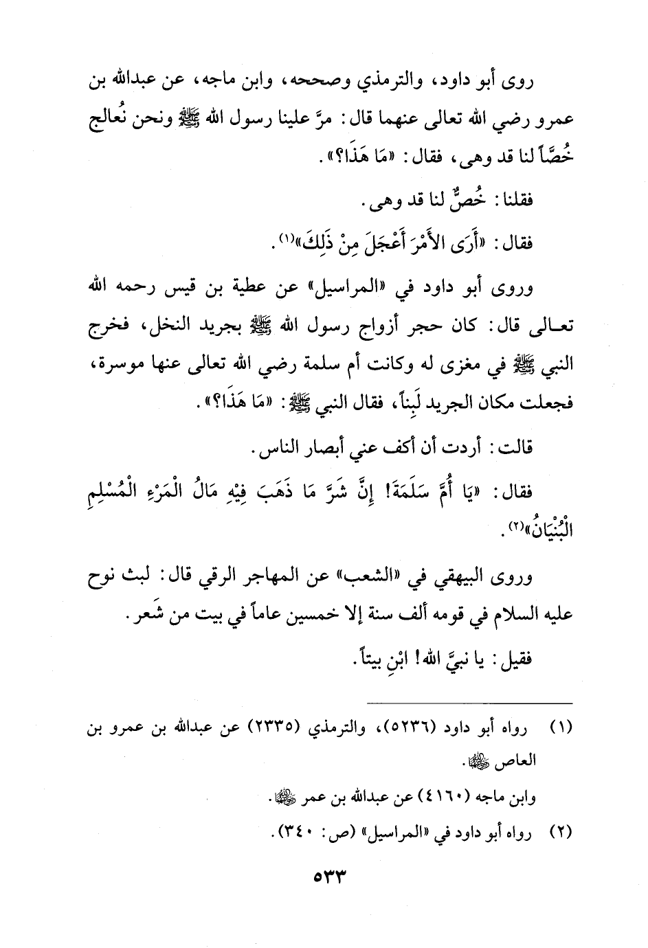 روى أبو داود، والترمذي وصححه، وابن ماجه، عن عبد الله بن عمرو رضي الله تعالى عنهما قال: مرَّ علينا رسول الله - صلى الله عليه وسلم - ونحن نُعالج خُصًّا لنا قد وهى، فقال: "مَا هَذَا؟ ".