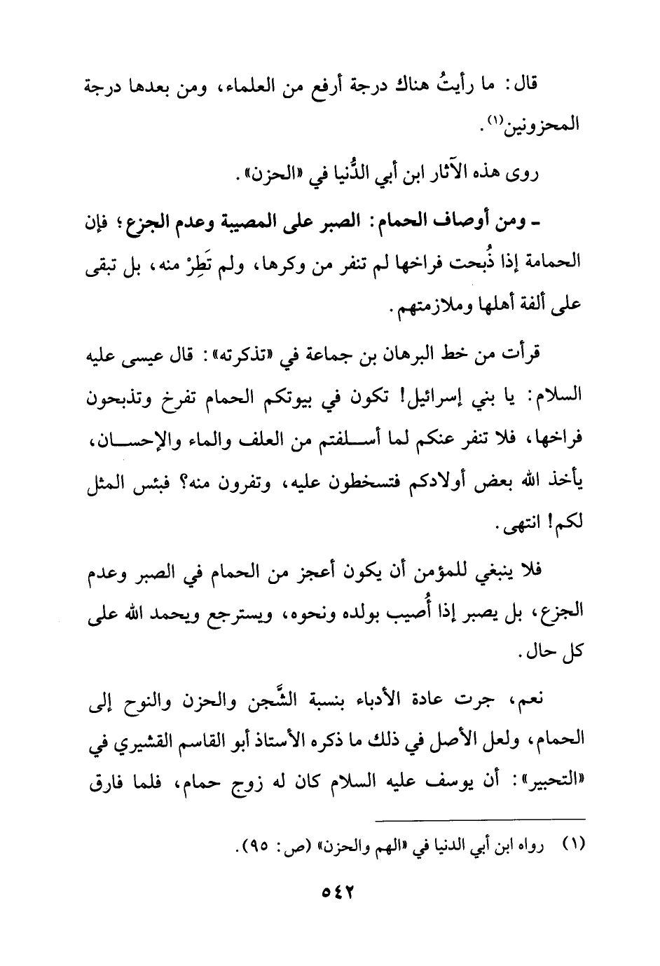 - ومن أوصاف الحمام: الصبر على المصيبة وعدم الجزع؛ فإن الحمامة إذا ذُبحت فراخها لم تنفر من وكرها، ولم تَطِرْ منه، بل تبقى على ألفة أهلها وملازمتهم.