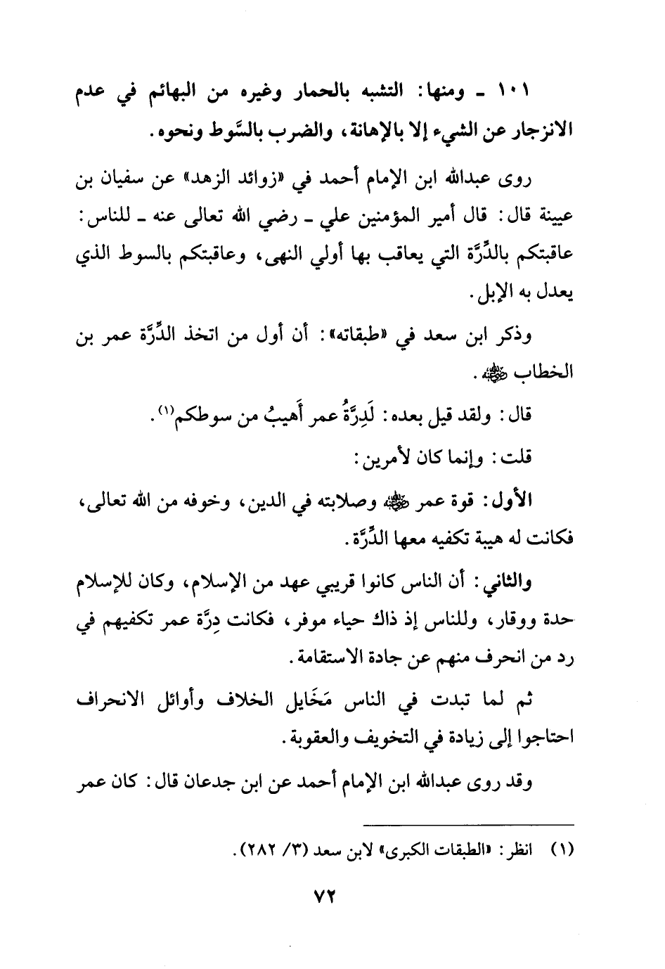 101 - ومنها: التشبه بالحمار وغيره من البهائم في عدم الانزجار عن الشيء إلا بالإهانة، والضرب بالسَّوط ونحوه.