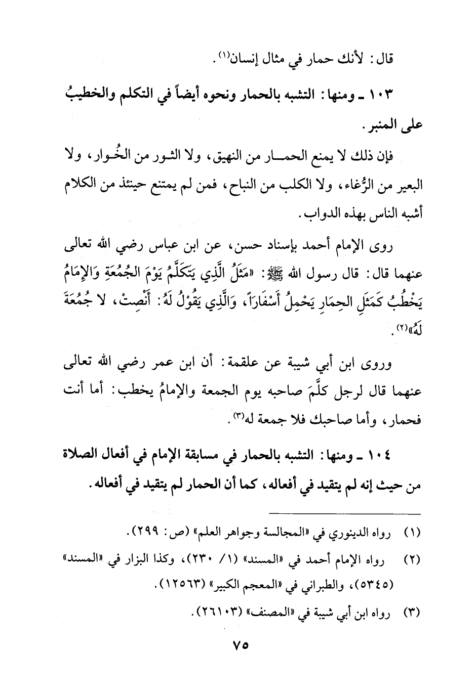 104 - ومنها: التشبه بالحمار في مسابقة الإِمام في أفعال الصلاة من حيث إنه لم يتقيد في أفعاله، كما أن الحمار لم يتقيد في أفعاله.