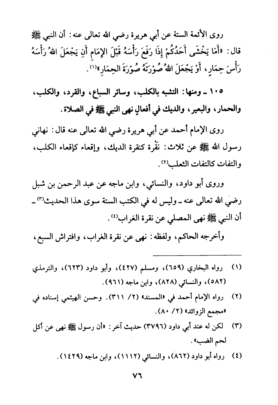 105 - ومنها: التشبه بالكلب، وسائر السمع، والقرد، والكلب، والحمار، والبعير، والديك في أفعالٍ نهى النبي - صلى الله عليه وسلم - في الصلاة.