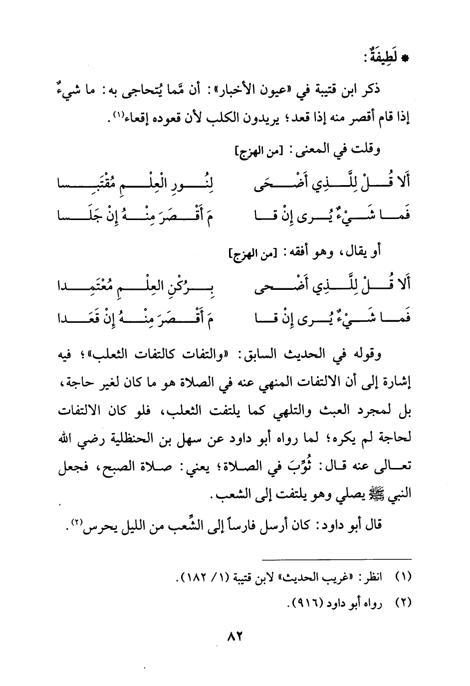 وقوله في الحديث السابق: "والتفات كالتفات الثعلب"؛ فيه إشارة إلى أن الالتفات المنهي عنه في الصلاة هو ما كان لغير حاجة، بل لمجرد العبث والتلهي كما يلتفت الثعلب، فلو كان الالتفات لحاجة لم يكره؛ لما رواه أبو داود عن سهل بن الحنظلية رضي الله تعالى عنه قال: ثُوِّبَ في الصلاة؛ يعني: صلاة الصبح، فجعل النبي - صلى الله عليه وسلم - يصلي وهو يلتفت إلى الشعب.