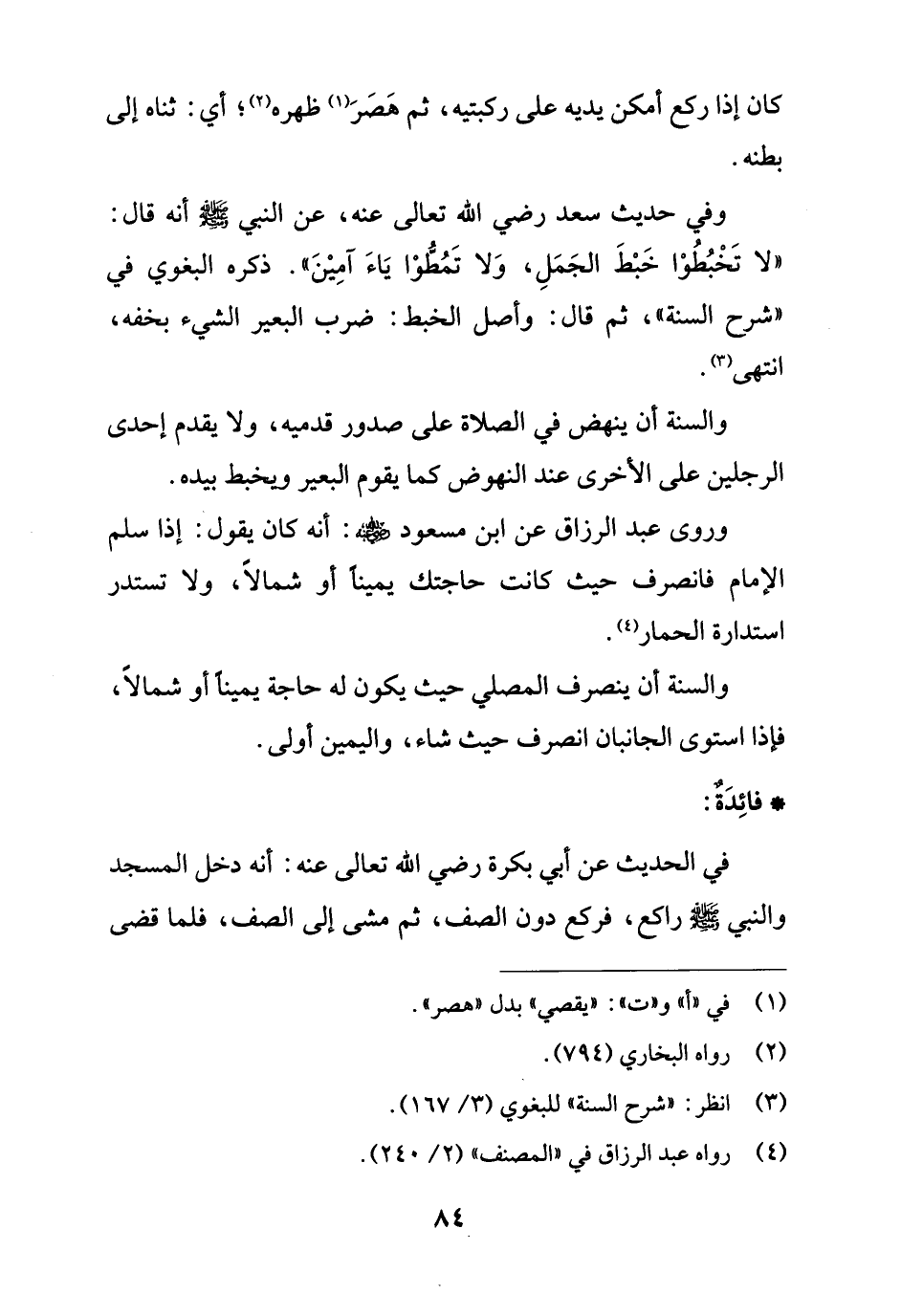 والسنة أن ينهض في الصلاة على صدور قدميه، ولا يقدم إحدى الرجلين على الأخرى عند النهوض كما يقوم البعير ويخبط بيده.