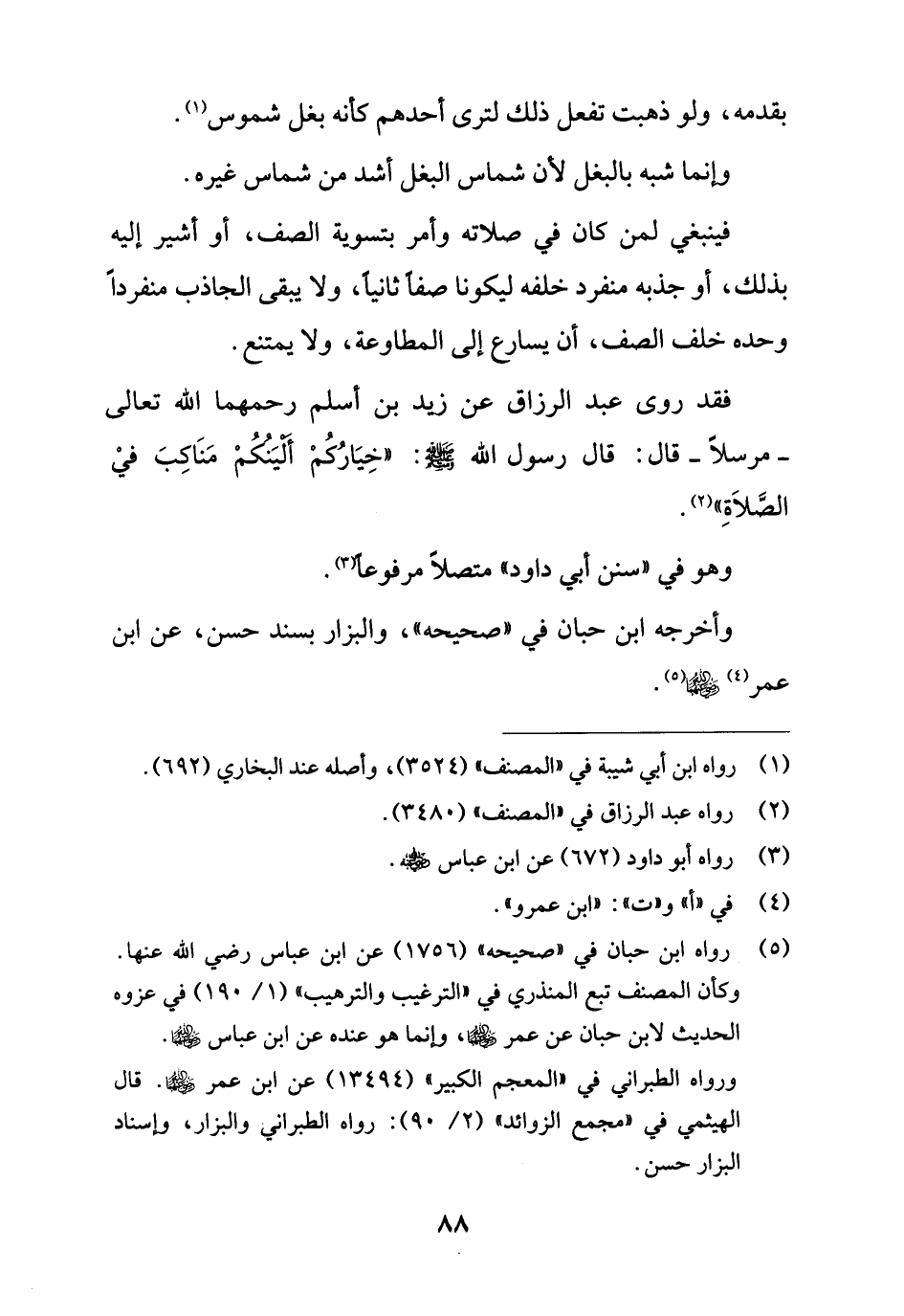 فقد روى عبد الرزاق عن زيد بن أسلم رحمهما الله تعالى -مرسلاً- قال: قال رسول الله - صلى الله عليه وسلم -: "خِيَارُكُمْ أليَنكُمْ مَنَاكِبَ فيْ الصَّلاَةِ" (¬2).