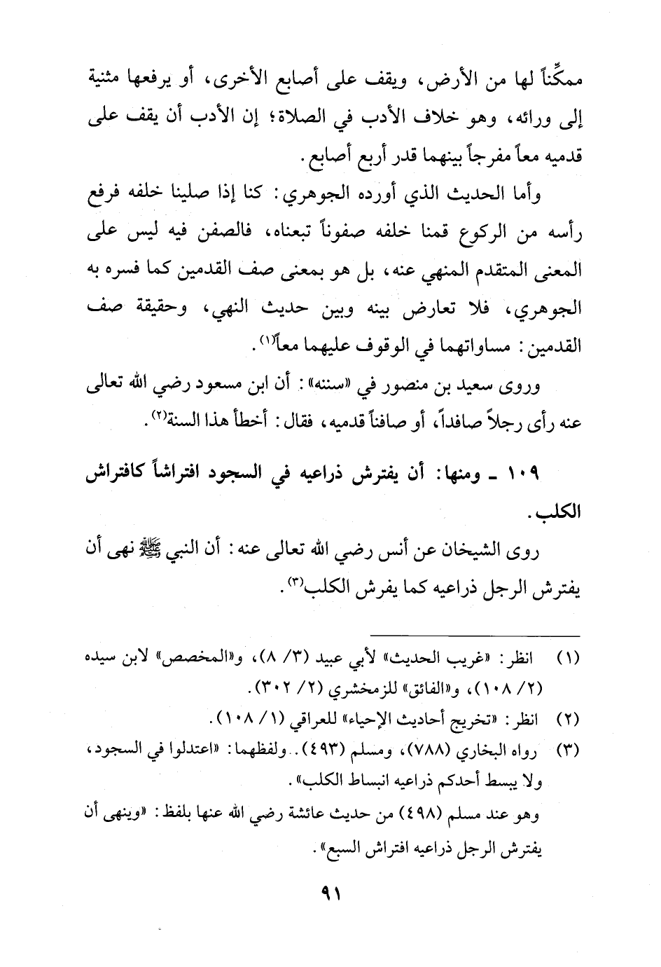 109 - ومنها: أن يفترش ذراعيه في السجود افتراشاً كافتراش الكلب.