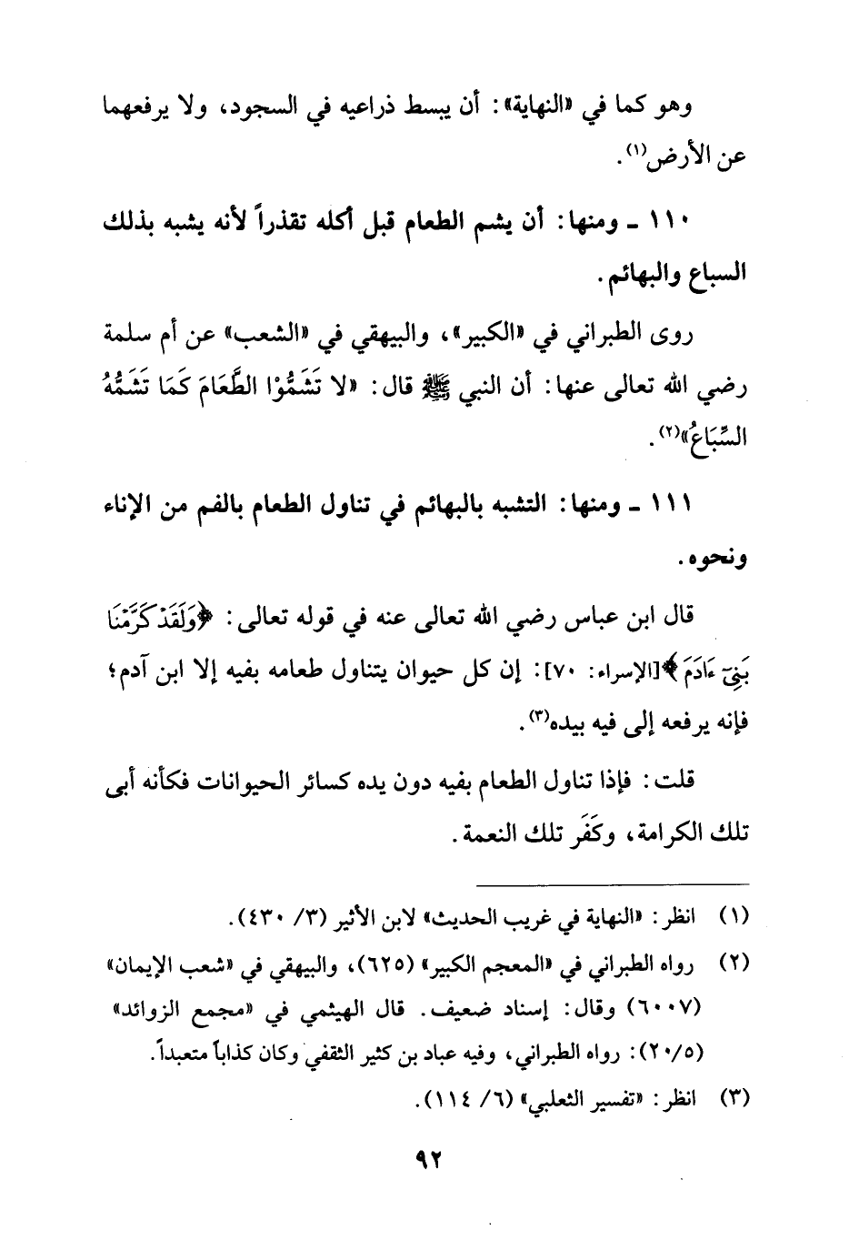 110 - ومنها: أن يشم الطعام قبل أكله تقذرًا لأنه يشبه بذلك السباع والبهائم.