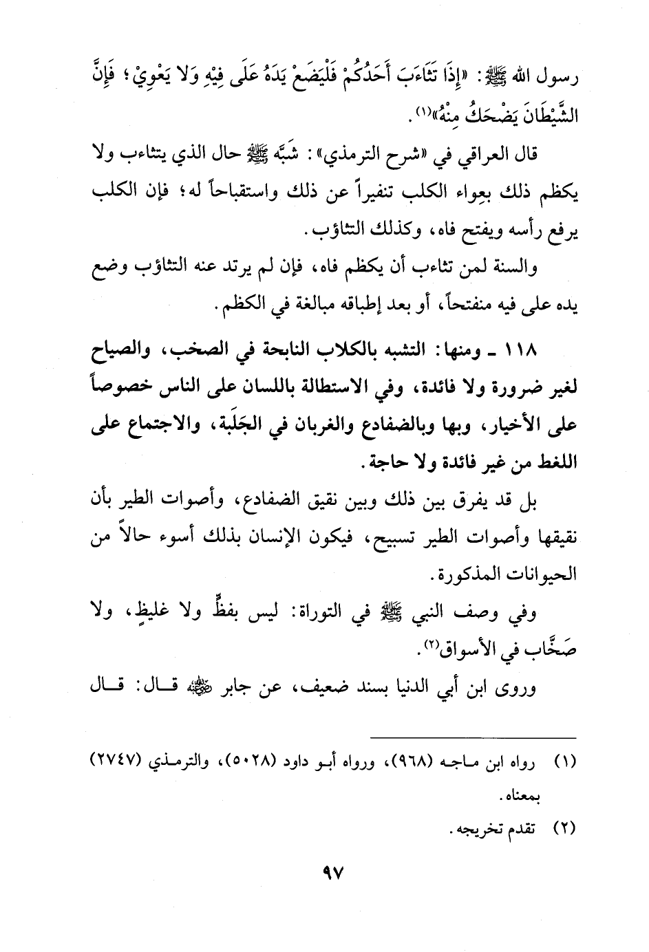 118 - ومنها: التشبه بالكلاب النابحة في الصخب، والصياح لغير ضرورة ولا فائدة، وفي الاستطالة باللسان على الناس خصوصاً على الأخيار، وبها وبالضفادع والغربان في الجَلَبة، والاجتماع على اللغط من غير فائدة ولا حاجة.