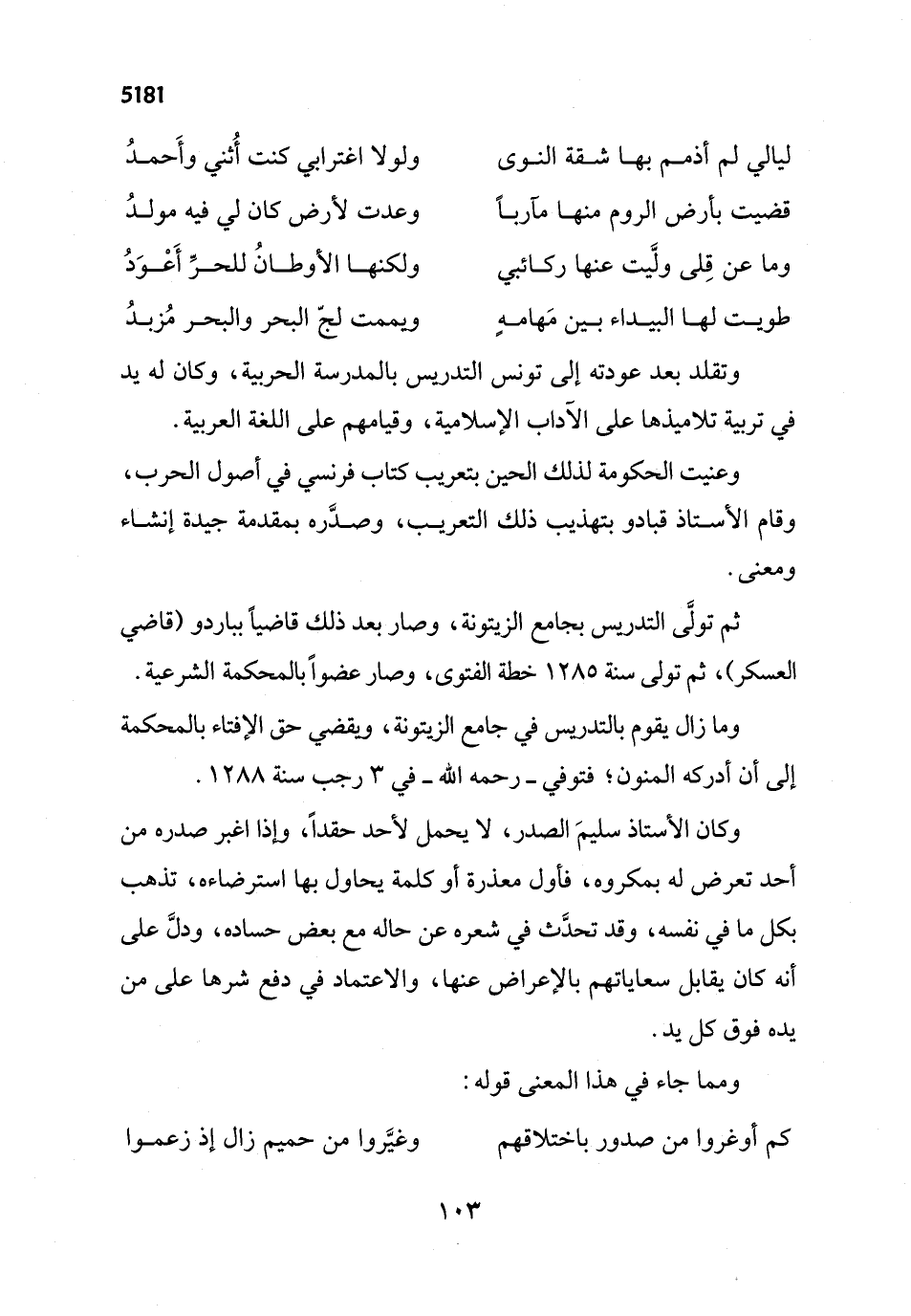 وما زال يقوم بالتدريس في جامع الزيتونة، ويقضي حق الإفتاء بالمحكمة إلى أن أدركه المنون؛ فتوفي -رحمه الله- في 3 رجب سنة 1288.