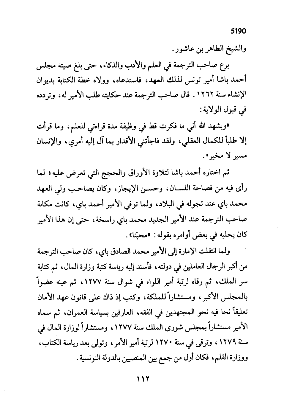 برع صاحب الترجمة في العلم والأدب والذكاء، حتى بلغ صيته مجلس أحمد باشا أمير تونس لذلك العهد، فاستدعاه، وولاه خطبة الكتابة بديوان الإنشاء سنة 1262. قال صاحب الترجمة عند حكايته طلب الأمير له، وتردده في قبول الولاية: