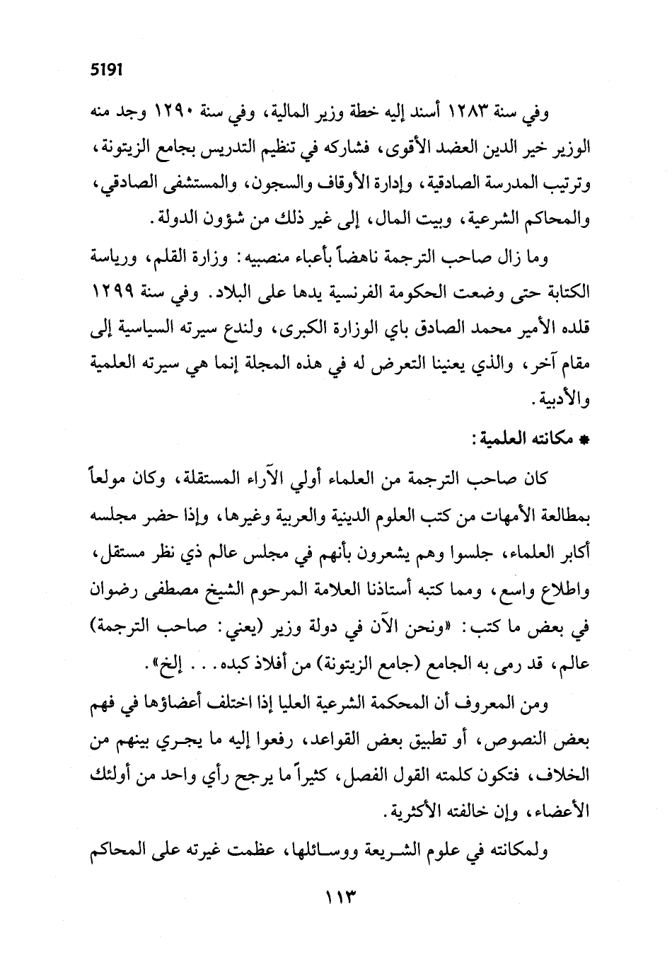 وما زال صاحب الترجمة ناهضاً بأعباء منصبيه: وزارة القلم، ورياسة الكتابة حتى وضعت الحكومة الفرنسية يدها على البلاد. وفي سنة 1299 قلده الأمير محمد الصادق باي الوزارة الكبرى، ولندع سيرته السياسية إلى مقام آخر، والذي يعنينا التعرض له في هذه المجلة إنما هي سيرته العلمية والأدبية.