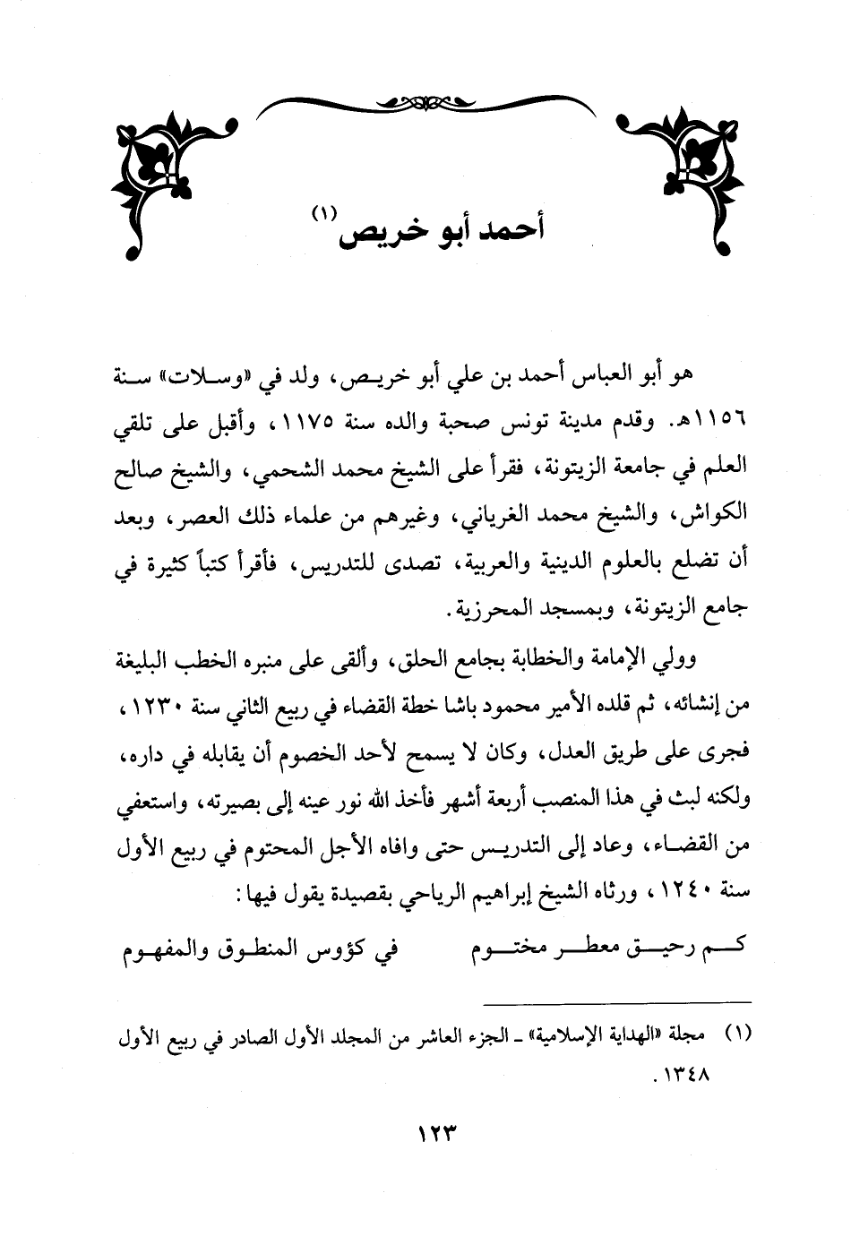 هو أبو العباس أحمد بن علي أبو خريص، ولد في "وسلات" سنة 1156 هـ. وقدم مدينة تونس صحبة والده سنة 1175، وأقبل على تلقي العلم في جامعة الزيتونة، فقرأ على الشيخ محمد الشحمي، والشيخ صالح الكواش، والشيخ محمد الغرياني، وغيرهم من علماء ذلك العصر، وبعد أن تضلع بالعلوم الدينية والعربية، تصدى للتدريس، فأقرأ كتباً كثيرة في جامع الزيتونة، وبمسجد المحرزية.