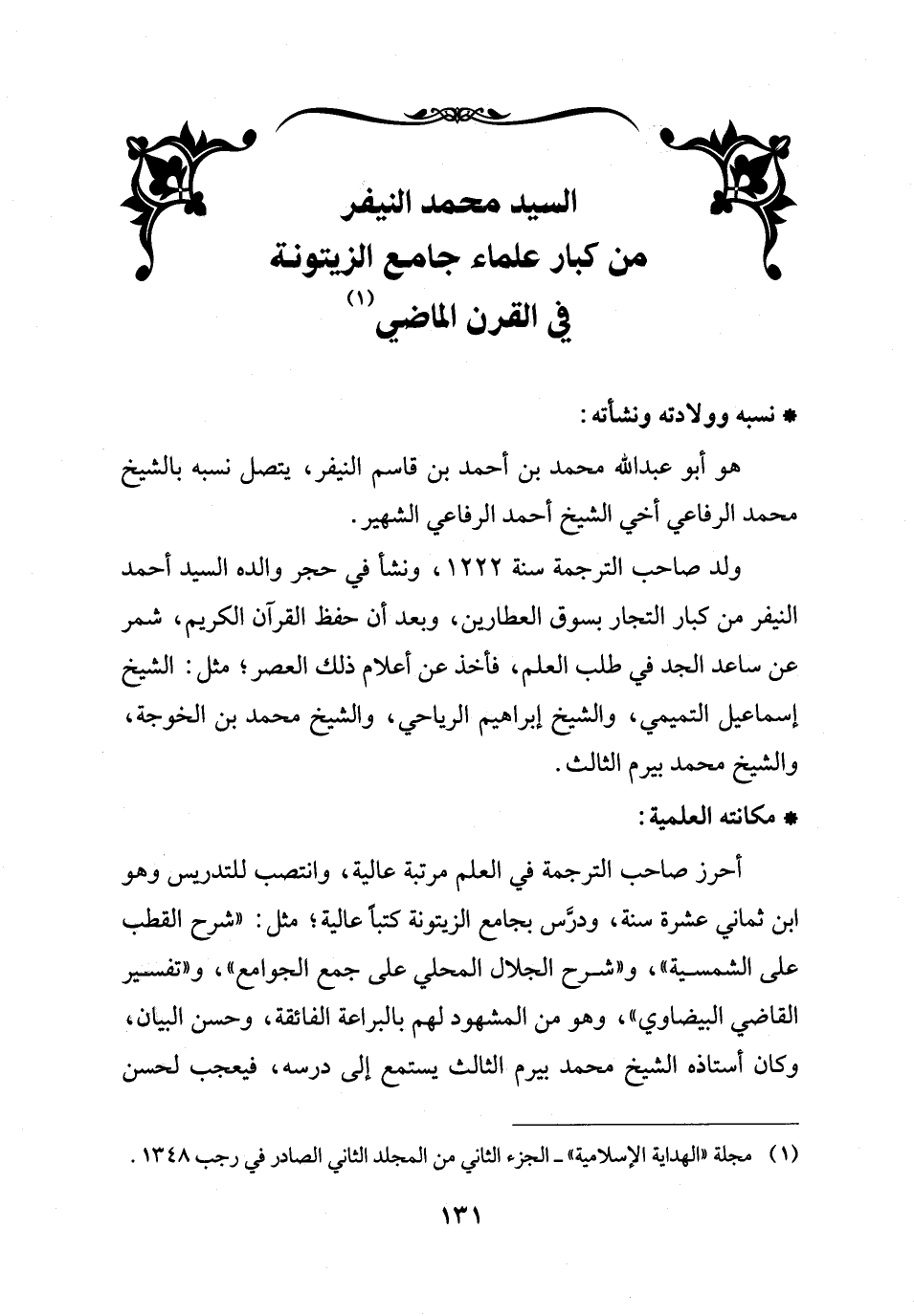السيد محمد النيفر من كبار علماء جامع الزيتونة في القرن الماضي (¬1)