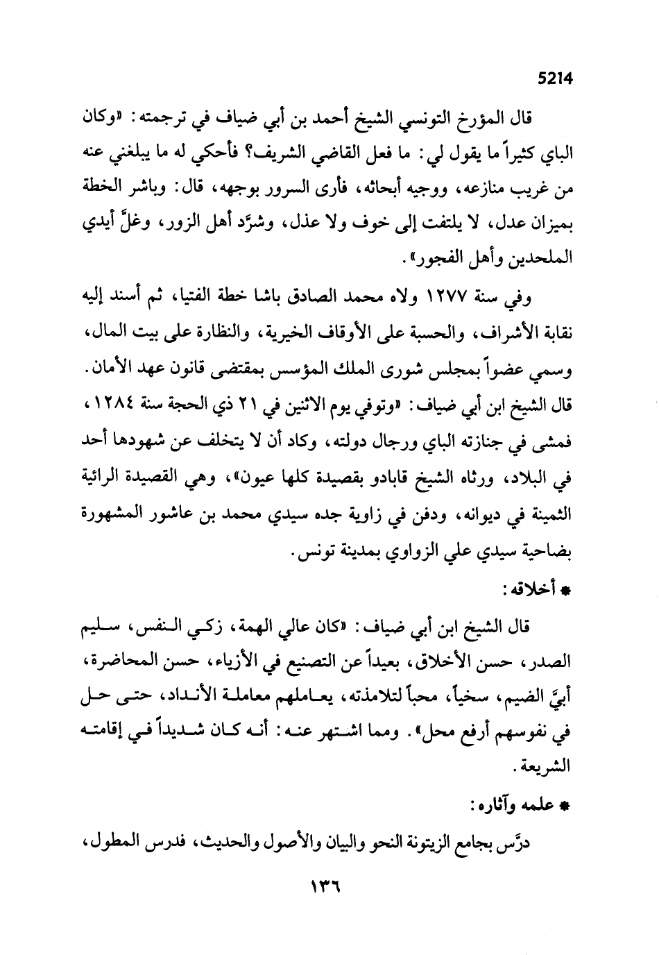 قال الشيخ ابن أبي ضياف: "كان عالي الهمة، زكي النفس، سليم الصدر، حسن الأخلاق، بعيداً عن التصنيع في الأزياء، حسن المحاضرة، أبيَّ الضيم، سخياً، محباً لتلامذته، يعاملهم معاملة الأنداد، حتى حل في نفوسهم أرفع محل". ومما اشتهر عنه: أنه كان شديداً في إقامته الشريعة.
