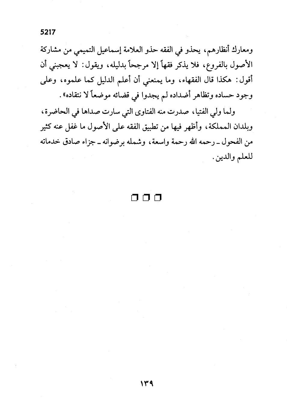 ومعارك أنظارهم، يحذو في الفقه حذو العلامة إسماعيل التميمي من مشاركة الأصول بالفروع، فلا يذكر فقهاً إلا مرجحاً بدليله، ويقول: لا يعجبني أن أقول: هكذا قال الفقهاء، وما يمنعني أن أعلم الدليل كما علموه، وعلى وجود حساده وتظاهر أضداده لم يجدوا في قضائه موضعاً لانتقاده".