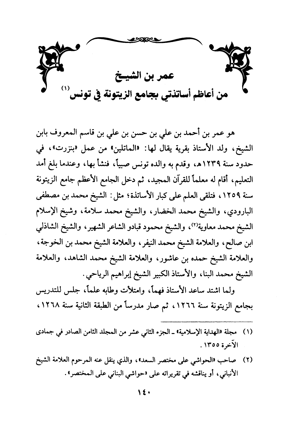 عمر بن الشيخ من أعاظم أساتذتي بجامع الزيتونة في تونس (¬1)