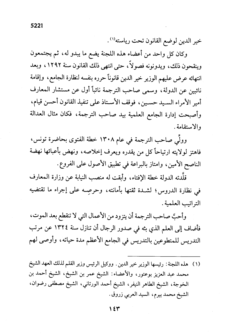 (¬1) هذه اللجنة: رئيسها الوزير خير الدين. ووكيل الرئيس وزير القلم لذلك العهد الشيخ محمد عبد العزيز بوعتور، والأعضاء: الشيخ عمر بن الشيخ، الشيخ أحمد بن الخوجة، الشيخ الطاهر النيفر، الشيخ أحمد الورتاني، الشيخ مصطفى رضوان، الشيخ محمد بيرم، السيد العربي زروق.