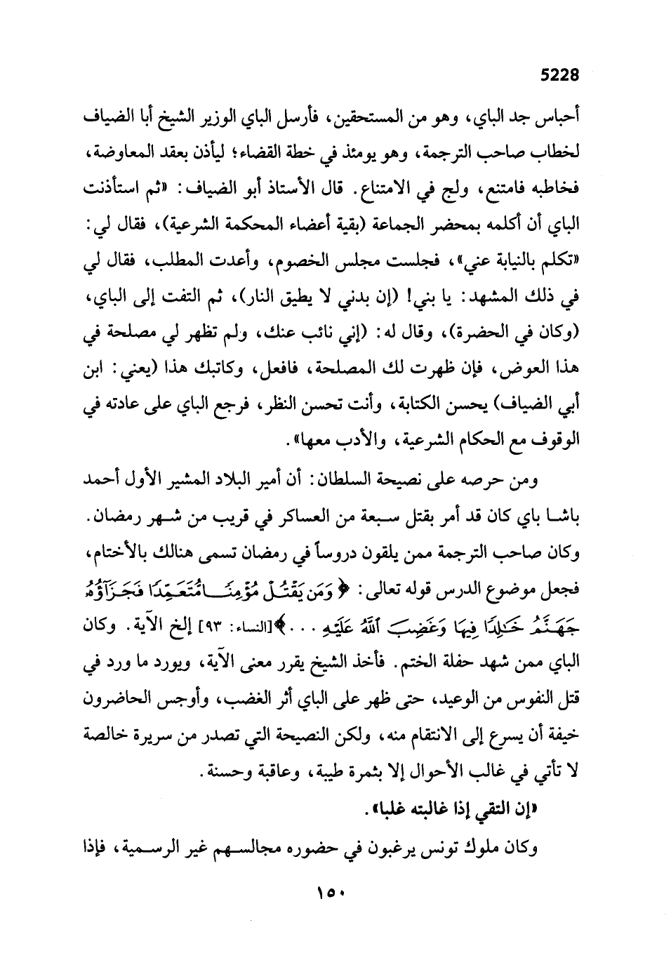 ومن حرصه على نصيحة السلطان: أن أمير البلاد المشير الأول أحمد باشا باي كان قد أمر بقتل سبعة من العساكر في قريب من شهر رمضان. وكان صاحب الترجمة ممن يلقون دروساً في رمضان تسمى هنالك بالأختام، فجعل موضوع الدرس قوله تعالى: {وَمَنْ يَقْتُلْ مُؤْمِنًا مُتَعَمِّدًا فَجَزَاؤُهُ جَهَنَّمُ خَالِدًا فِيهَا وَغَضِبَ اللَّهُ عَلَيْهِ. . .} [النساء: 93] إلخ الآية. وكان الباي ممن شهد حفلة الختم. فأخذ الشيخ يقرر معنى الآية، ويورد ما ورد في قتل النفوس من الوعيد، حتى ظهر على الباي أثر الغضب، وأوجس الحاضرون خيفة أن يسرع إلى الانتقام منه، ولكن النصيحة التي تصدر من سريرة خالصة لا تأتي في غالب الأحوال إلا بثمرة طيبة، وعاقبة وحسنة.