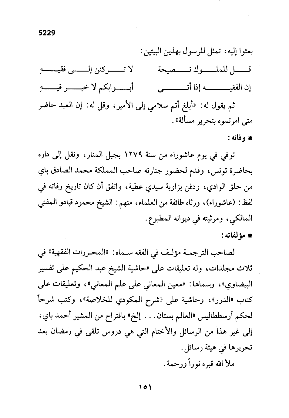 لصاحب الترجمة مؤلف في الفقه سماه: "المحررات الفقهية" في ثلاث مجلدات، وله تعليقات على "حاشية الشيخ عبد الحكيم على تفسير البيضاوي"، وسماها: "معين المعاني على علم المعاني"، وتعليقات على كتاب "الدرر"، وحاشية على "شرح المكودي للخلاصة"، وكتب شرحاً لحكم أرسططاليس "العالم بستان. . . إلخ" باقتراح من المشير أحمد باي، إلى غير هذا من الرسائل والأختام التي هي دروس تلقى في رمضان بعد تحريرها في هيئة رسائل.