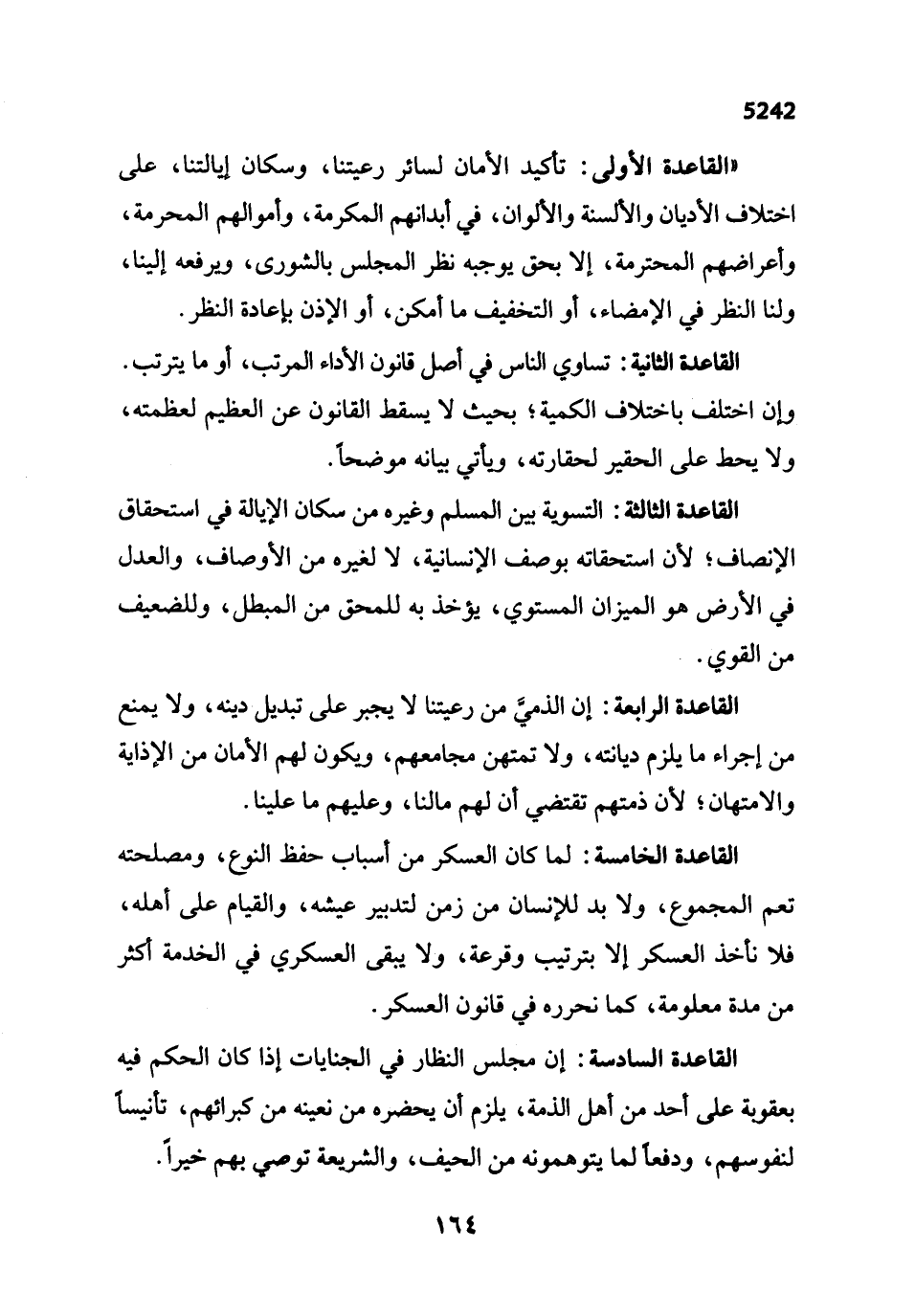القاعدة الرابعة: إن الذميَّ من رعيتنا لا يجبر على تبديل دينه، ولا يمنع من إجراء ما يلزم ديانته، ولا تمتهن مجامعهم، ويكون لهم الأمان من الإذاية والامتهان؛ لأن ذمتهم تقتضي أن لهم مالنا، وعليهم ما علينا.