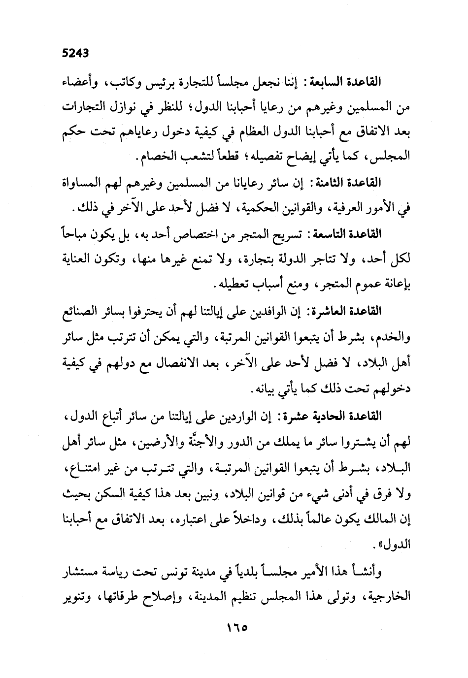 القاعدة السابعة: إننا نجعل مجلساً للتجارة برئيس وكاتب، وأعضاء من المسلمين وغيرهم من رعايا أحبابنا الدول؛ للنظر في نوازل التجارات بعد الاتفاق مع أحبابنا الدول العظام في كيفية دخول رعاياهم تحت حكم المجلس، كما يأتي إيضاح تفصيله؛ قطعاً لتشعب الخصام.
