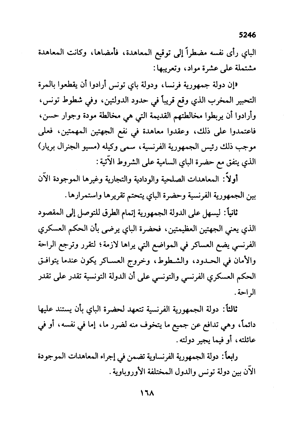 ثالثاً: دولة الجمهورية الفرنسية تتعهد لحضرة الباي بأن يستند عليها دائماً، وهي تدافع عن جميع ما يتخوف منه لضرر ما، إما في نفسه، أو في عائلته، أو فيما يجير دولته.