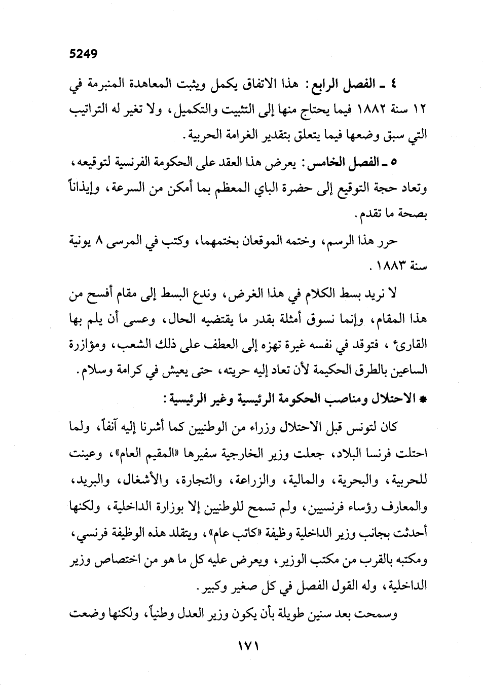 5 - الفصل الخامس: يعرض هذا العقد على الحكومة الفرنسية لتوقيعه، وتعاد حجة التوقيع إلى حضرة الباي المعظم بما أمكن من السرعة، وإيذاناً بصحة ما تقدم.