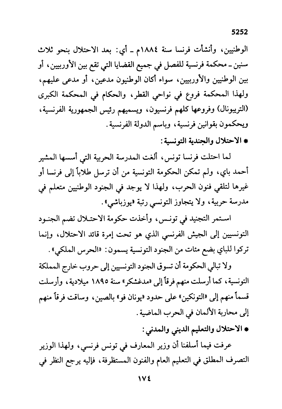 الوطنيين، وأنشأت فرنسا سنة 1884 م -أي: بعد الاحتلال بنحو ثلاث سنين- محكمة فرنسية للفصل في جميع القضايا التي تقع بين الأوربيين، أو بين الوطنيين والأوربيين، سواء كان الوطنيون مدعين، أو مدعى عليهم، ولهذا المحكمة فروع في نواحي القطر، والحكام في المحكمة الكبرى (التريبونال) وفروعها كلهم فرنسيون، ويسميهم رئيس الجمهورية الفرنسية، ويحكمون بقوانين فرنسية، وباسم الدولة الفرنسية.