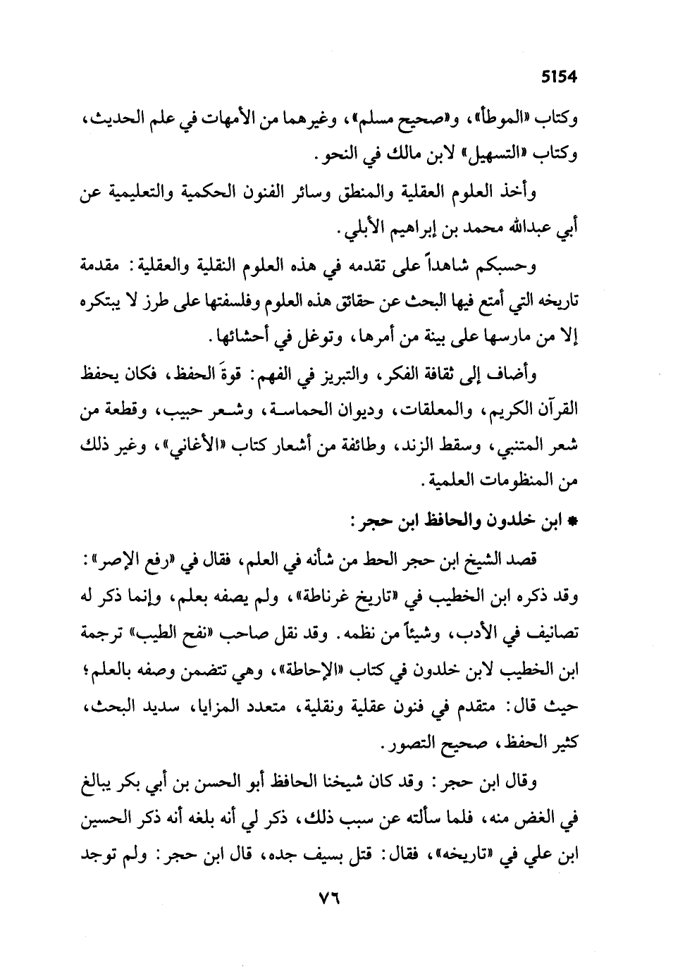 قصد الشيخ ابن حجر الحط من شأنه في العلم، فقال في "رفع الإصر": وقد ذكره ابن الخطيب في "تاريخ غرناطة"، ولم يصفه بعلم، وإنما ذكر له تصانيف في الأدب، وشيئًا من نظمه. وقد نقل صاحب "نفح الطيب" ترجمة ابن الخطيب لابن خلدون في كتاب "الإحاطة"، وهي تتضمن وصفه بالعلم؛ حيث قال: متقدم في فنون عقلية ونقلية، متعدد المزايا، سديد البحث، كثير الحفظ، صحيح التصور.